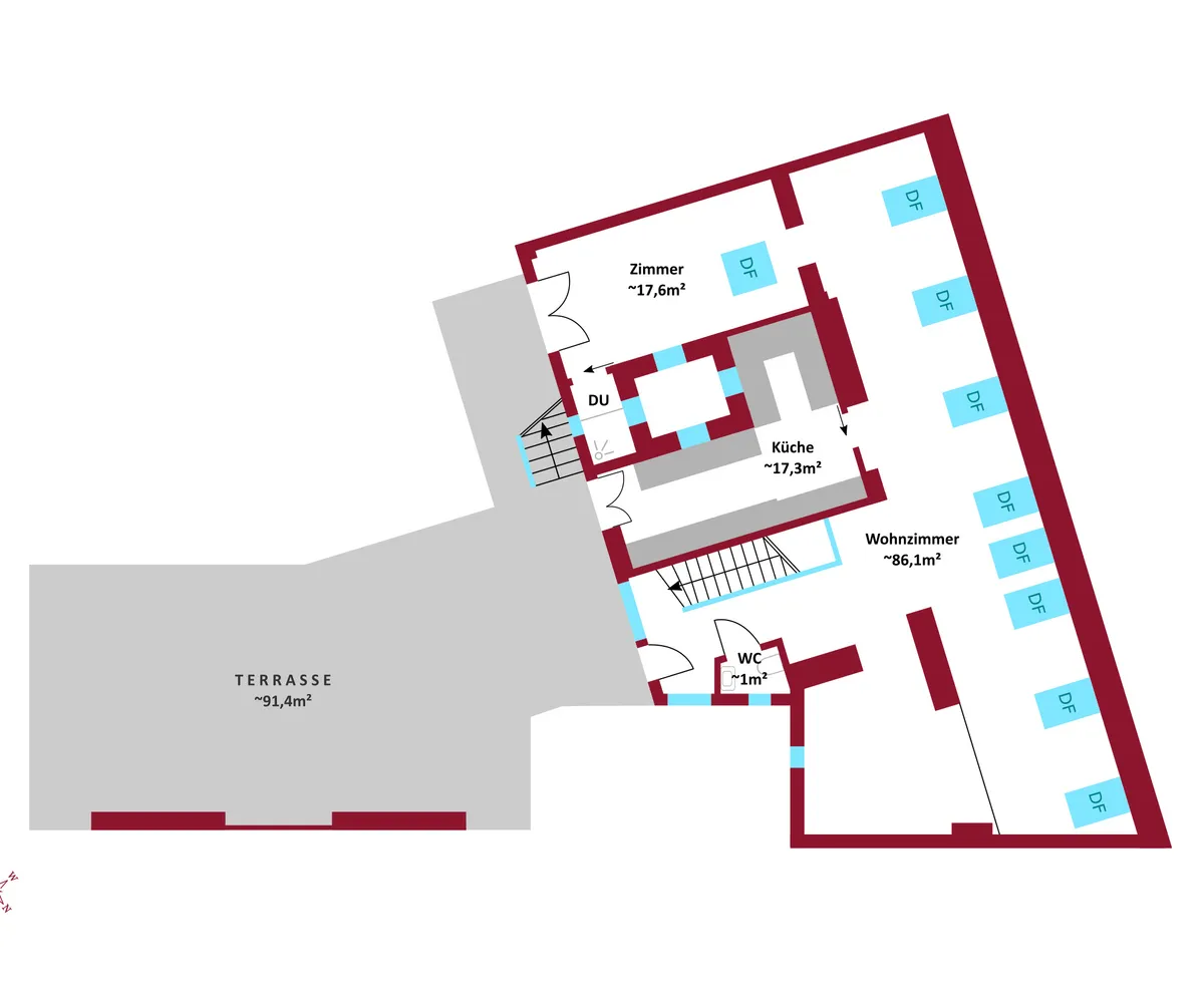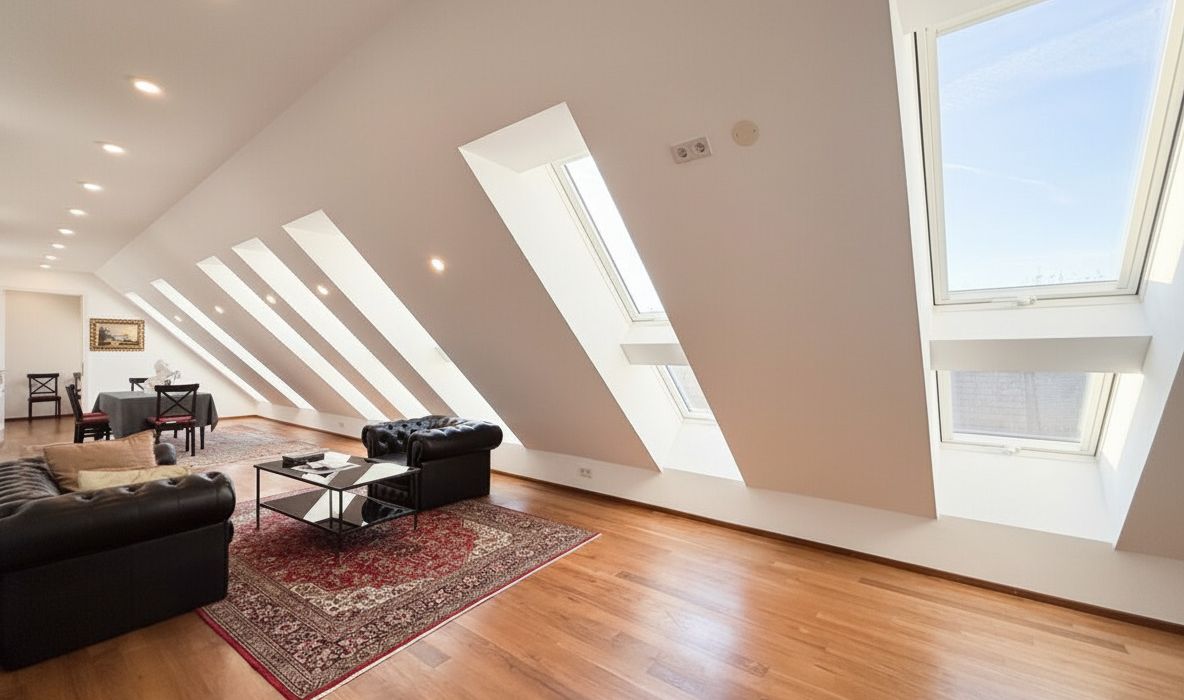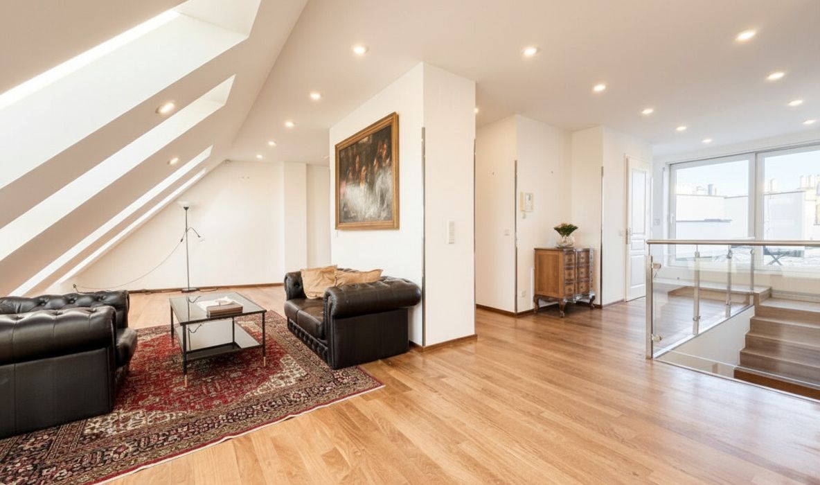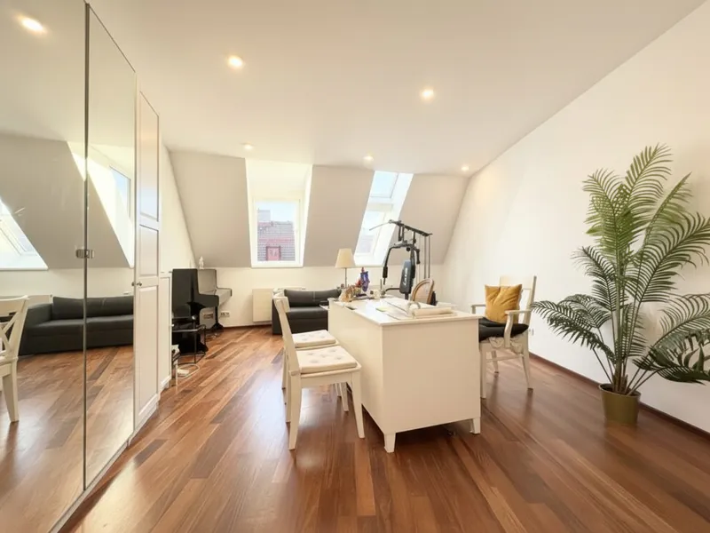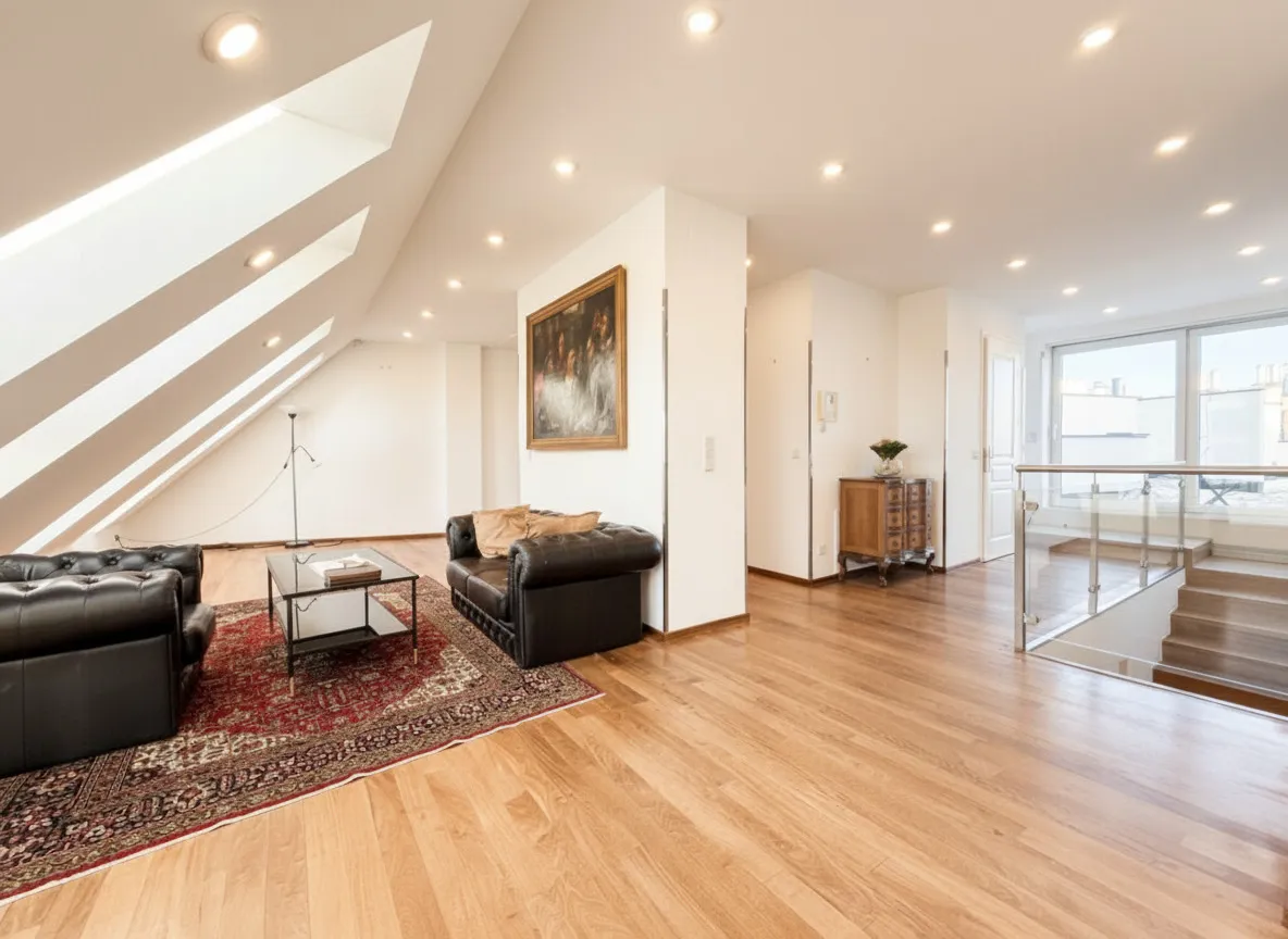 Diese außergewöhnliche, lichtdurchflutete Dachgeschosswohnung besticht durch ihre großzügige Raumaufteilung , ihren besonderen Wohncharakter und die äußerst zentrale Lage . Auf der unteren Ebene erwarten Sie vier geräumige Schlafzimmer , zwei separat begehbare Badezimmer, zwei WCs, eine praktische Waschküche sowie ein Abstellraum . Die optimal geschnittenen Zimmer bieten viel Tageslicht und schaffen eine warme, einladende Wohnatmosphäre.