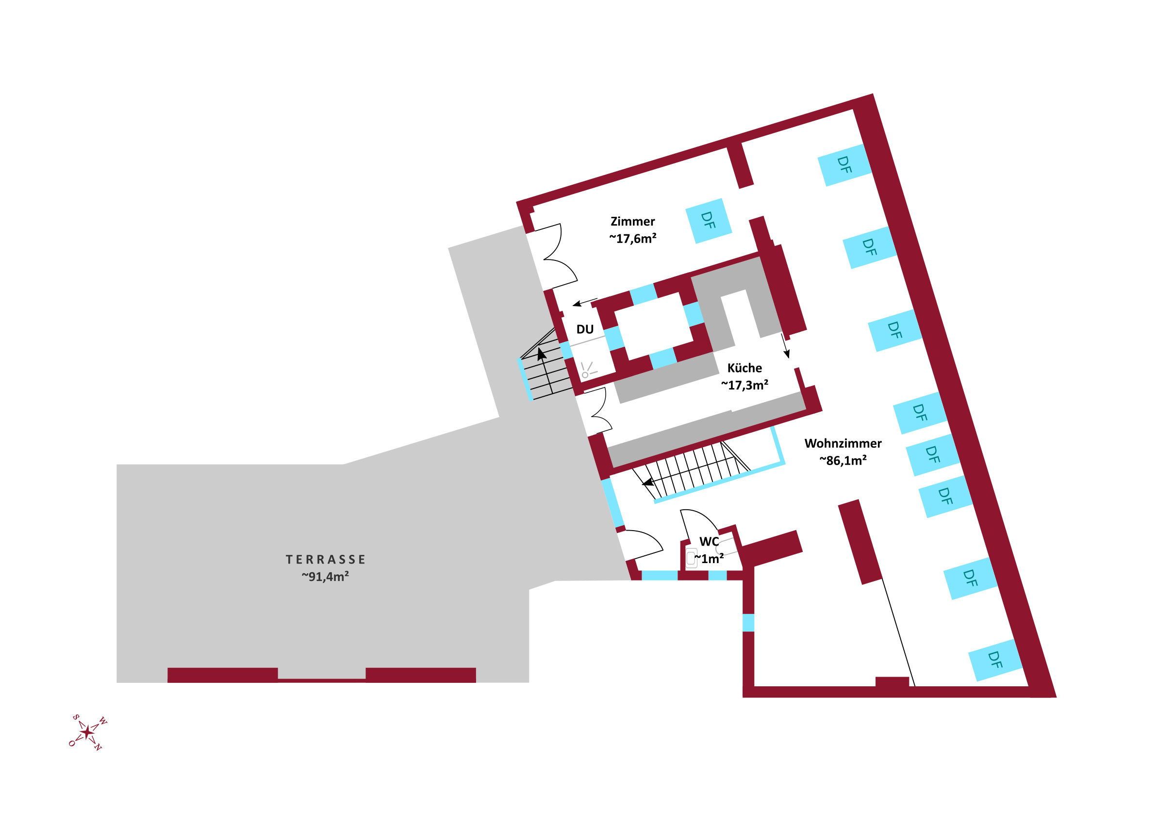 Das Herzstück der Wohnung befindet sich im Obergeschoss: Ein weitläufiger, offener Wohnbereich mit großflächigen Fensterfronten , der nahtlos in die separat abgetrennte Küche übergeht. Dieser Bereich bietet den idealen Rahmen zum Entspannen, Genießen und für gesellige Abende mit Familie und Freunden. Ein weiteres WC befindet sich zudem komfortabel gelegen direkt neben dem Zugang zur Terrasse.