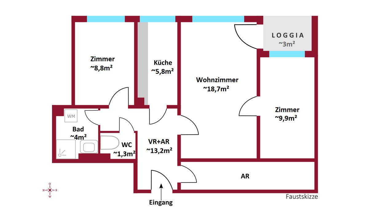 Die gut aufgeteilte Wohnfläche von ca. 61,5m² erstreckt sich über die folgenden Räumlichkeiten:
