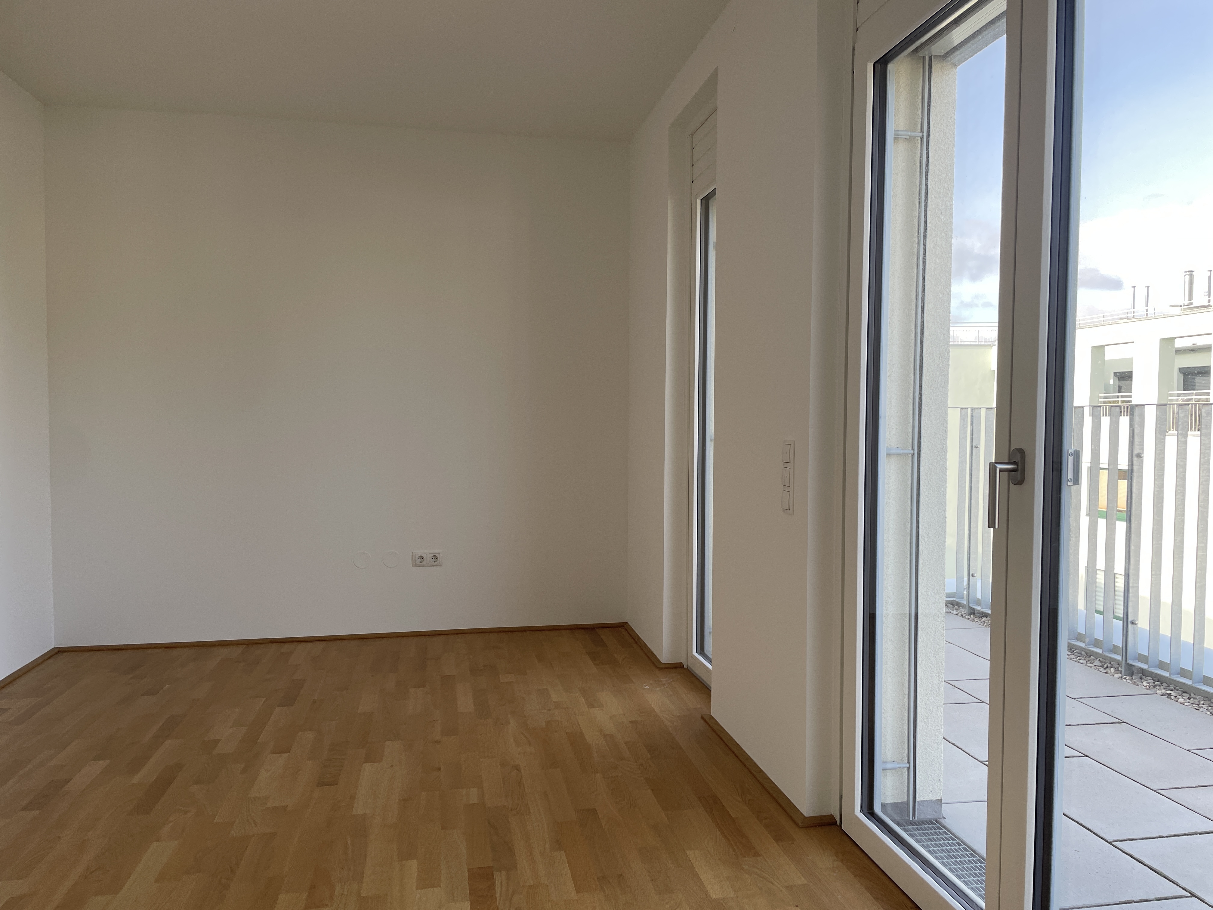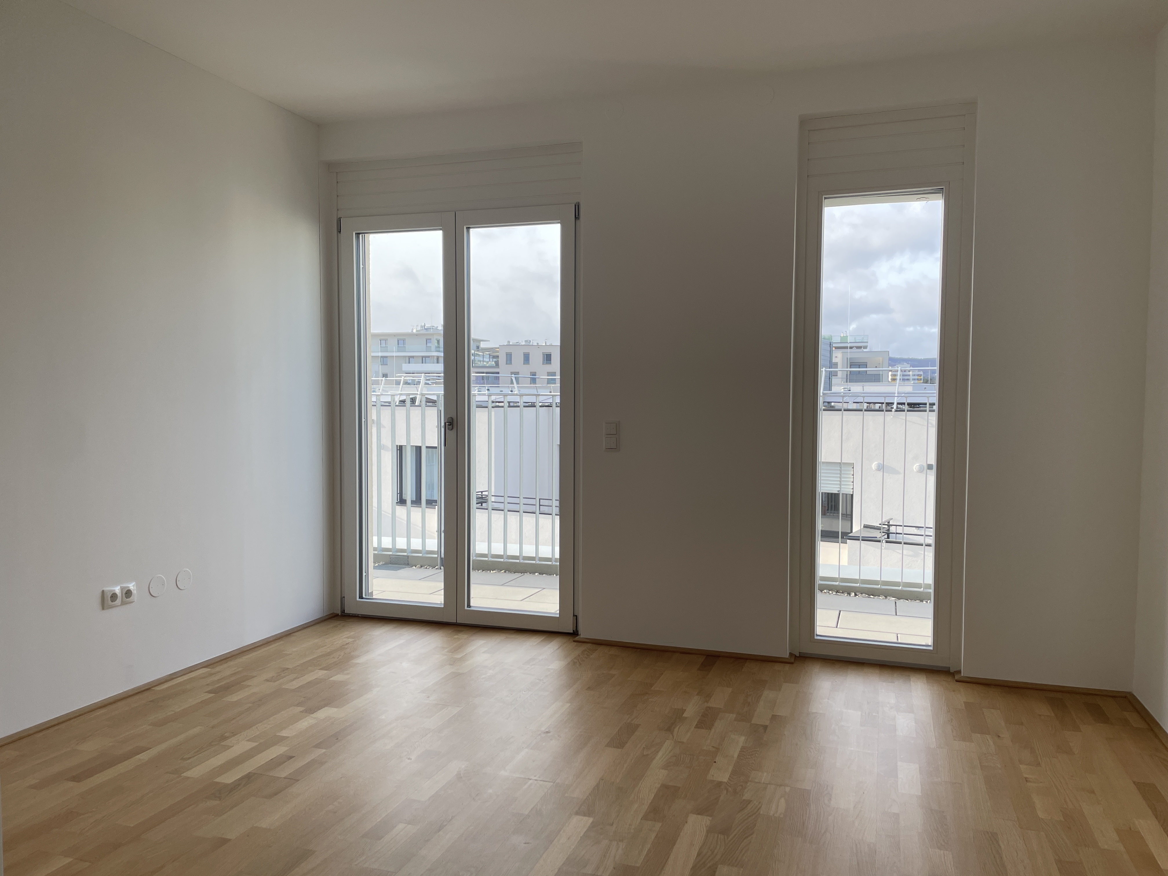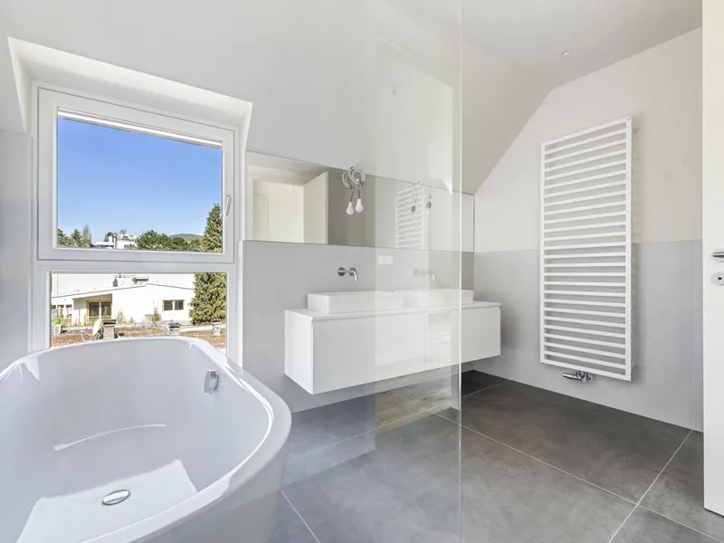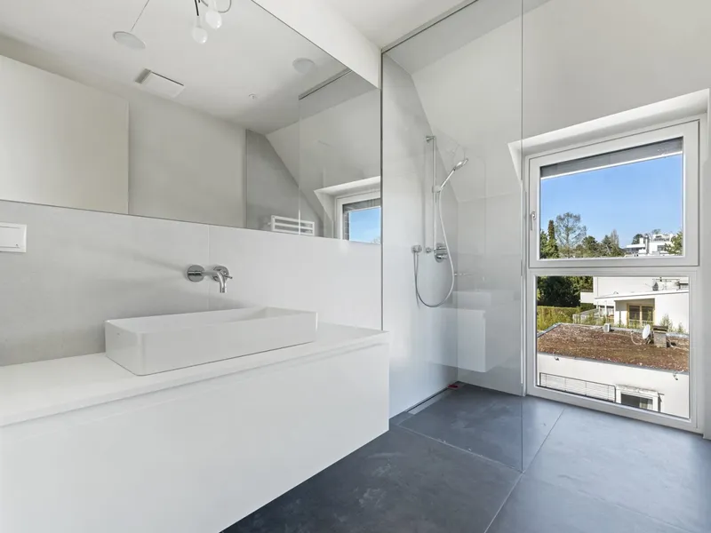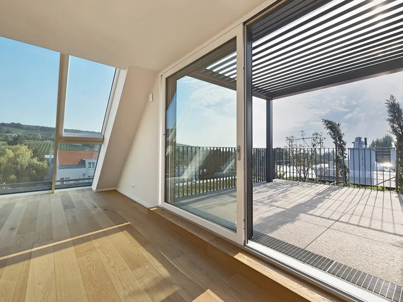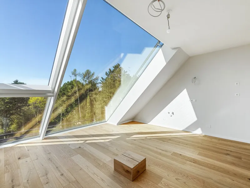 Eichenparkettböden, Holz-Alu-Fenster und Außenjalousien schaffen ein stilvolles Ambiente mit natürlicher Wärme. Dank Smart-Home-Vorbereitung, Fußbodenheizung und Raumkühlung über Bauteilaktivierung genießen Bewohnerinnen und Bewohner ein ausgewogenes Wohnklima zu jeder Jahreszeit.