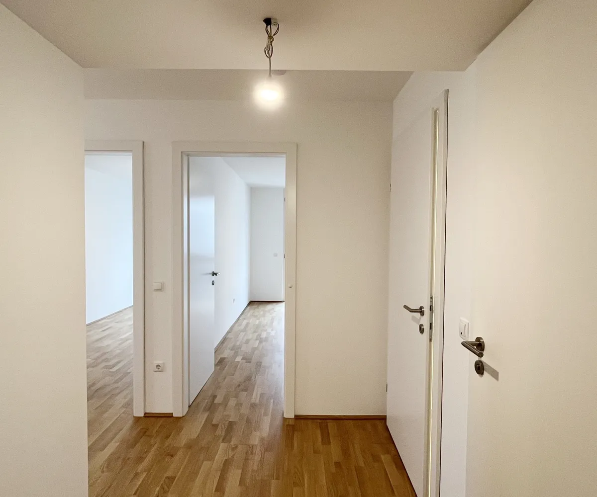 Eichenparkettböden, Holz-Alu-Fenster und Außenjalousien schaffen ein stilvolles Ambiente mit natürlicher Wärme. Dank Smart-Home-Vorbereitung, Fußbodenheizung und Raumkühlung über Bauteilaktivierung genießen Bewohnerinnen und Bewohner ein ausgewogenes Wohnklima zu jeder Jahreszeit.