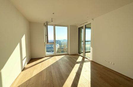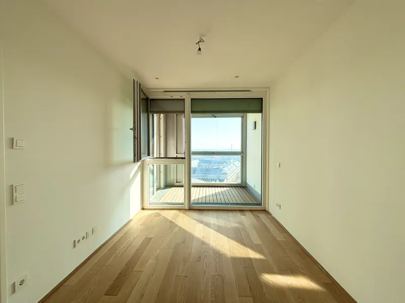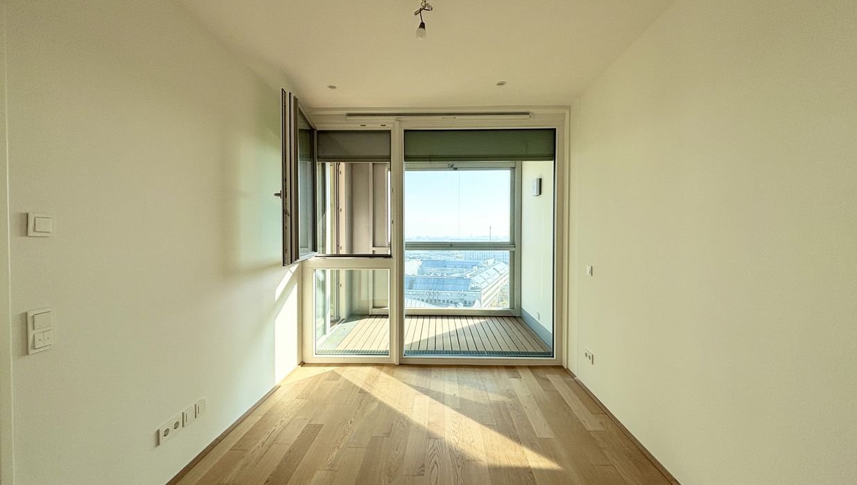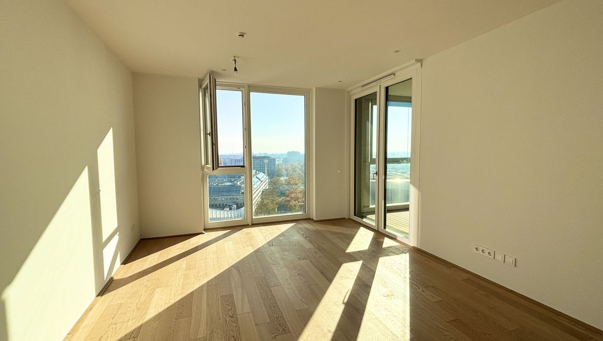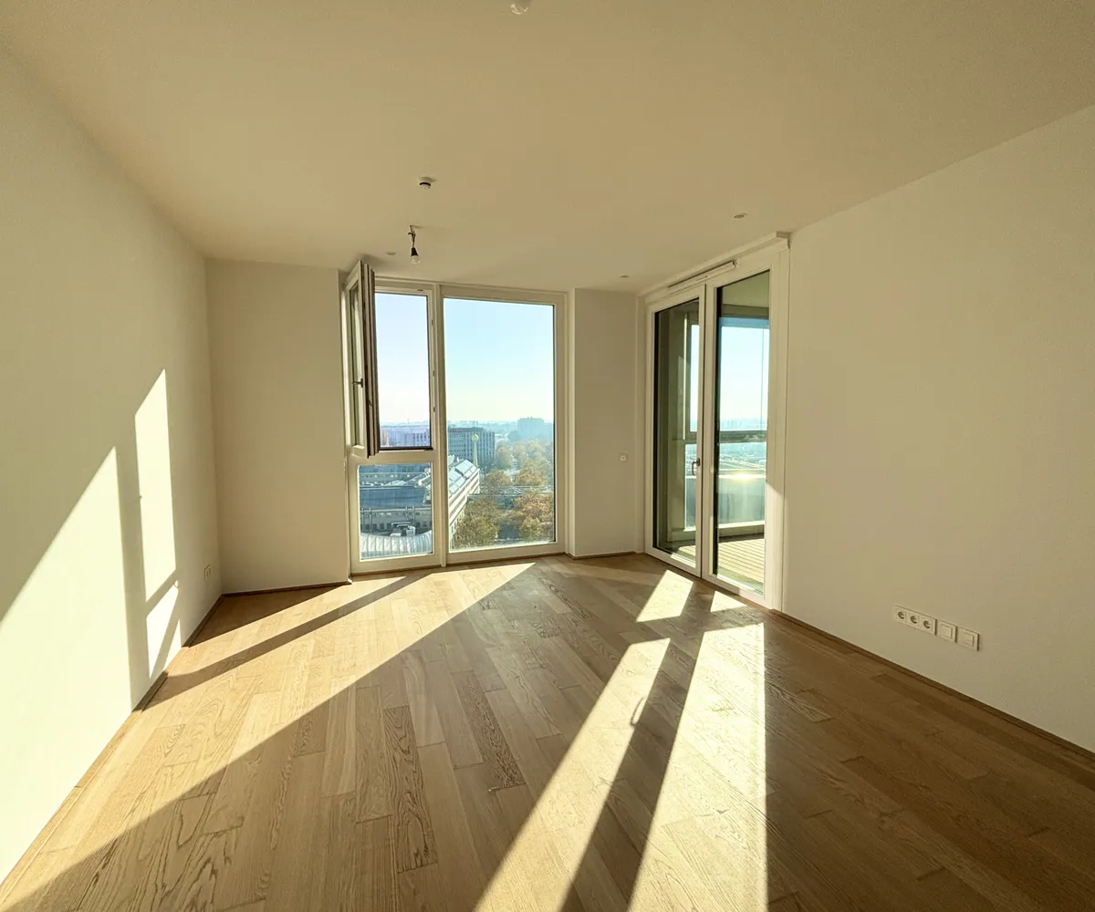 Top 106 ist klar und smart aufgeteilt: vom Vorraum aus gelangen Sie in das Badezimmer, das separat gelegene WC sowie in den Abstellraum . Der Vorraum verbindet den Eingangsbereich mit dem luftigen, lichtdurchfluteten Wohnzimmer, in dem sich eine hochwertige Einbauküche befindet. Vom Wohnzimmer aus erreichen Sie die Loggia , die einen unvergesslichen Blick über Wien und die Alte Donau bietet. Das Schlafzimmer mit ca. 12 m² sorgt für Komfort und bietet einen ruhigen Rückzugsort der Gelassenheit.