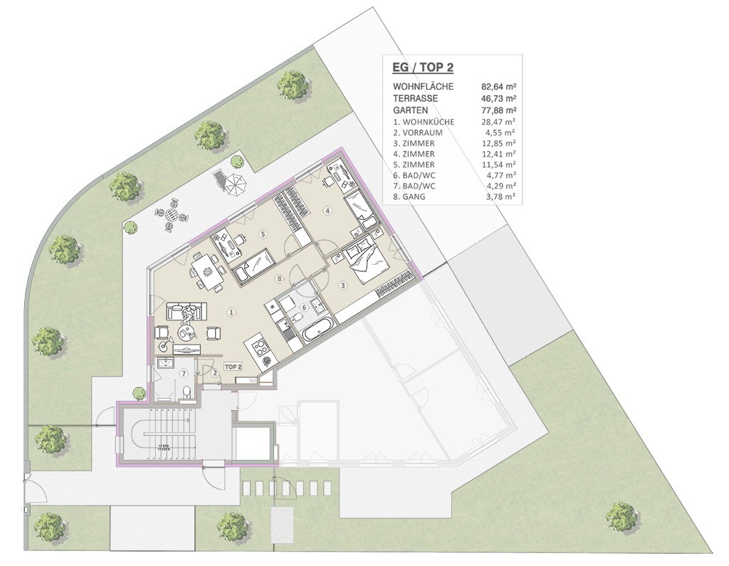 Top 2 bietet eine Wohnfläche von ca. 83 m², drei Schlafzimmer mit direktem Zugang zur Terrasse bzw. zum großzügigen Garten, die sich auch ideal als Kinderzimmer oder Arbeitszimmer/Homeoffice eignen. Zwei Badezimmer – jeweils mit WC – sorgen für zusätzlichen Komfort. Der private Garten mit rund 78 m² eröffnet Ihnen ein seltenes Maß an Freiraum: perfekt für eine üppige Bepflanzung und liebevoll angelegte Kräuter- und Gemüsebeete.