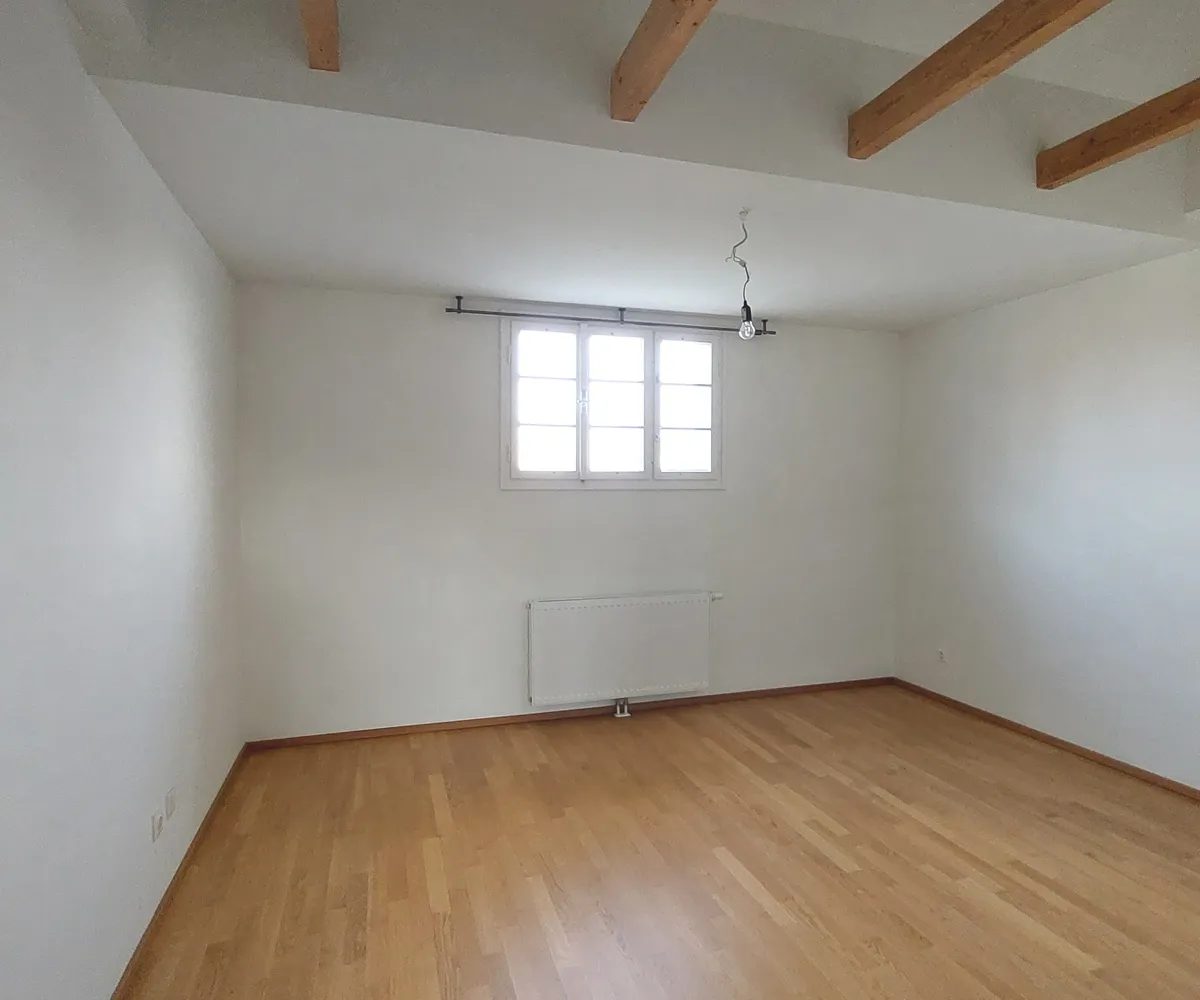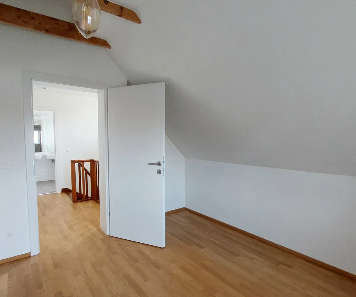 Im 1. Obergeschoß befinden sich drei Schlafzimmer (eines davon als Durchgangszimmer ausgeführt) mit charmanten Dachbalken, sowie ein Badezimmer mit Badewanne, Doppelwaschbecken und WC.