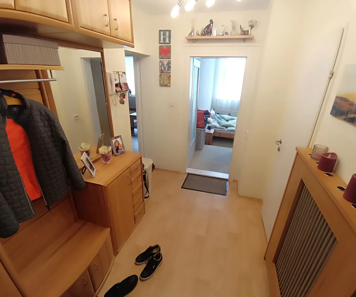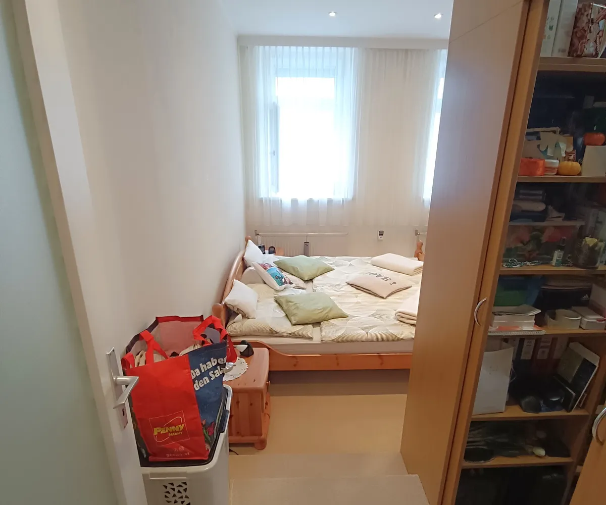 Vom Vorraum aus sind sämtliche Zimmer zentral begehbar und der flexible Grundriss lässt Änderungen zu. In einer praktischen Nische im Vorraum wurden Waschmaschine und Wäschetrockner untergebracht. Ebenfalls im Vorraum befindet sich die Toilette mit Handwaschbecken . Das Schlafzimmer selbst verfügt über rund 20 m² und der praktische Schrankverbau mit Beleuchtung bietet einen großzügigen Stauraum für Ihre Kleidung.