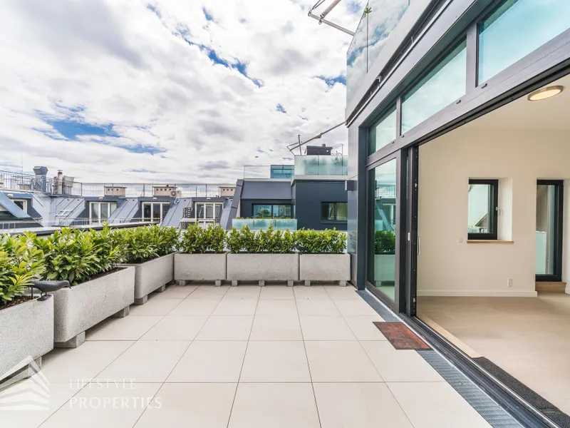 Die Dachebene besteht aus einer einzigartigen Galerie mit weitläufiger Terrasse mit ca. 63 m². Ein privater ca. 7,5 m² großer Nirosta Wateredgepool erwartet Sie auf dieser Ebene, von welcher Sie über die Dächer im Herzen der Wiener Innenstadt blicken. Die Granitblumentröge mit Kirschlorbeer werden automatisch bewässert und ein Sonnensegel spendet generösen Schatten. Auf den Terrassen sind alle Anschlüsse für eine Sommerküche vorhanden.