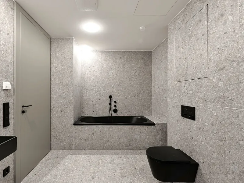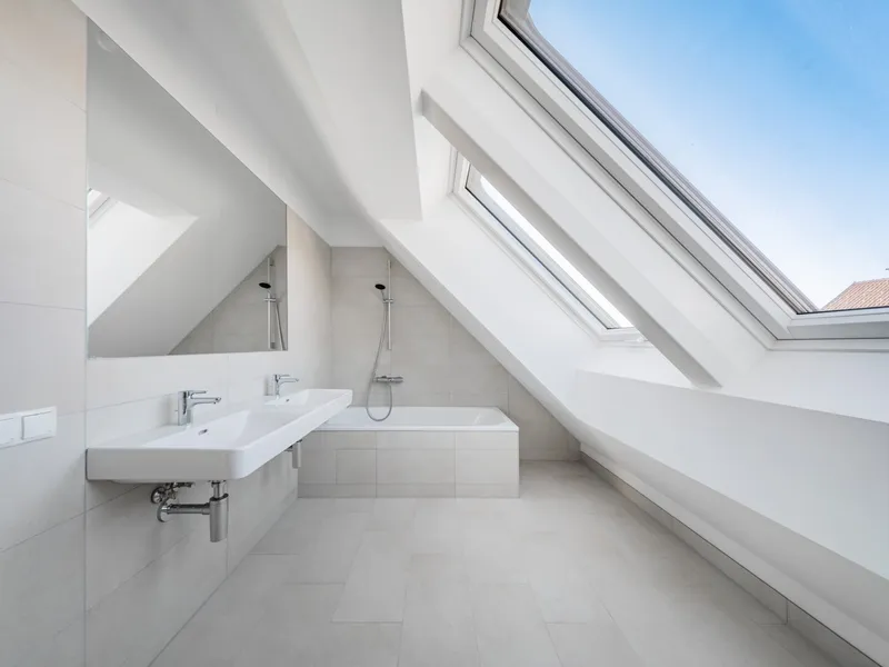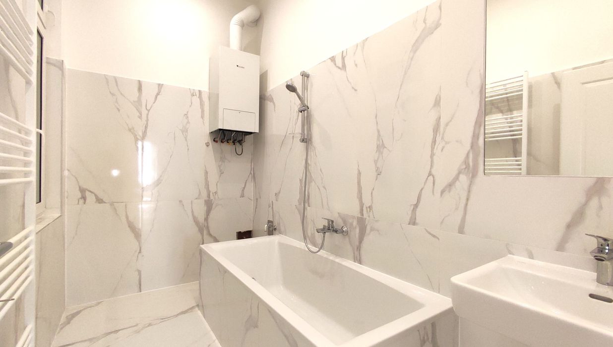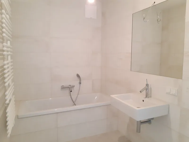 - Badezimmer mit Badewanne und Waschmaschinen-Anschluss