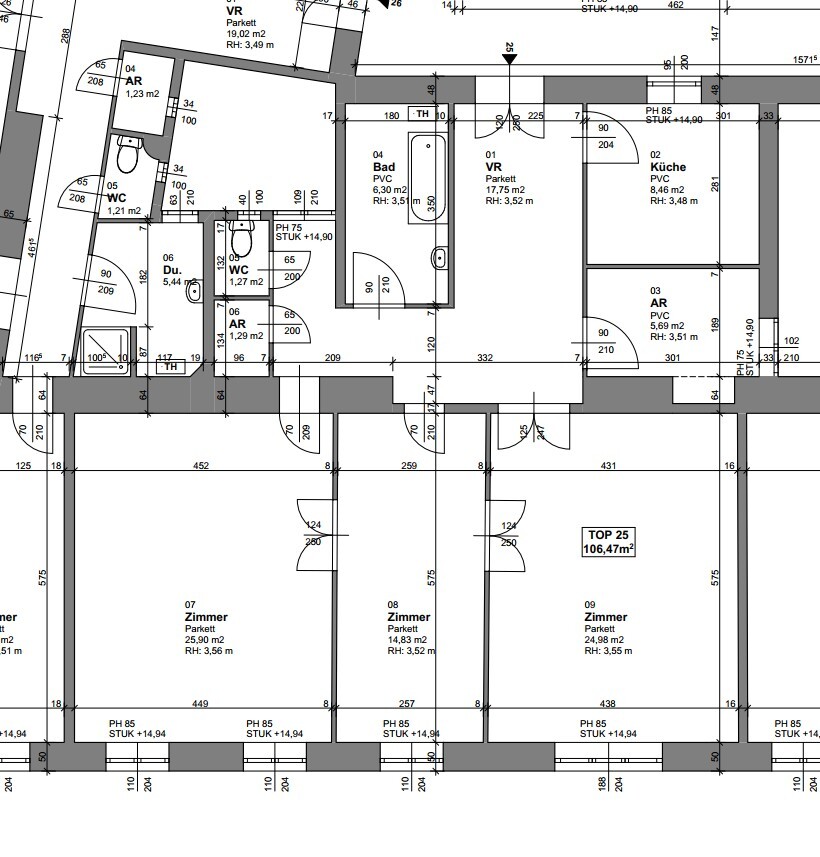 Ebenso vom Vorraum aus zu betreten sind die 3 Zimmer mit einer Fläche von jeweils rund 25,90 m², sowie 14,83 m² und 24,98 m² . Ob nun als Paar mit Office-Bereich, für Familien mit Kinderzimmer, oder als Wohngemeinschaft - Hier erwarten Sie wirklich alle Möglichkeiten.