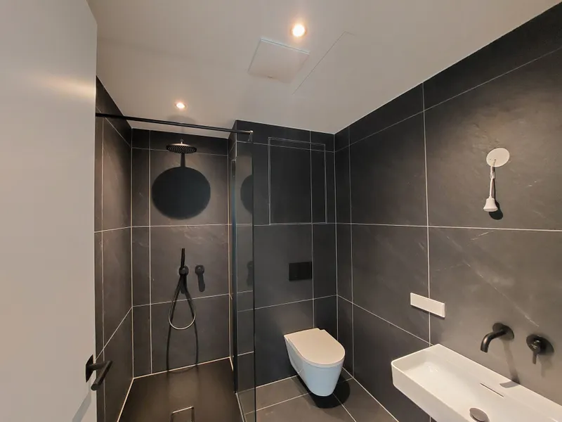 Hochwertige Parkettböden in Wohnräumen und Fliesen in Nassräumen.