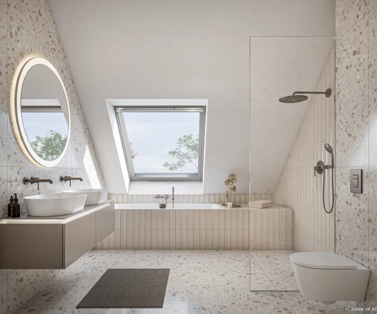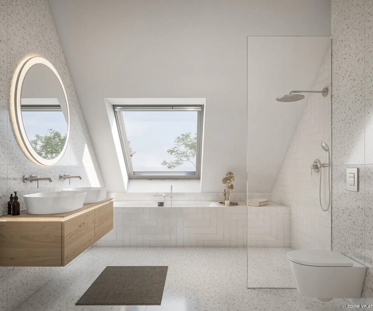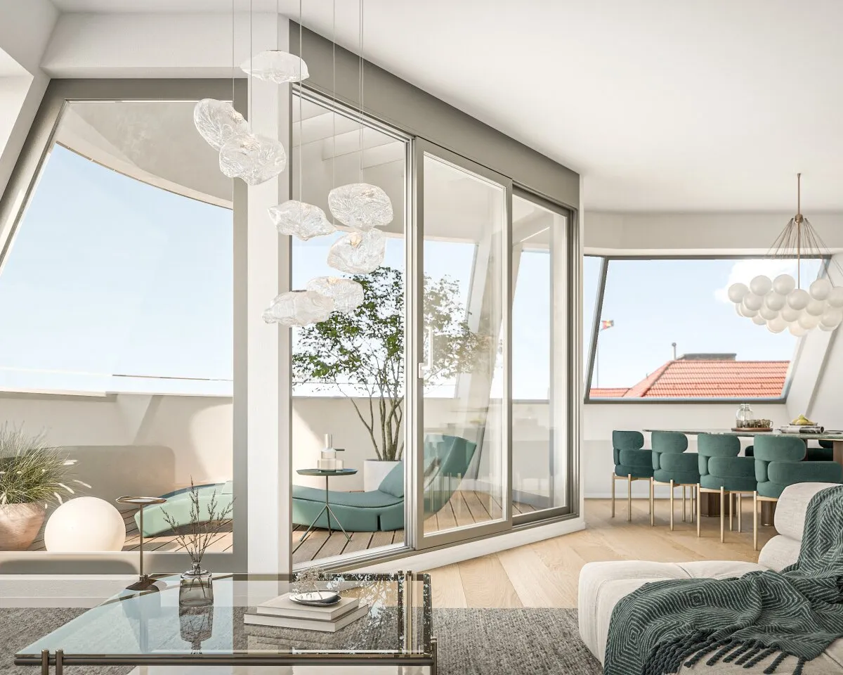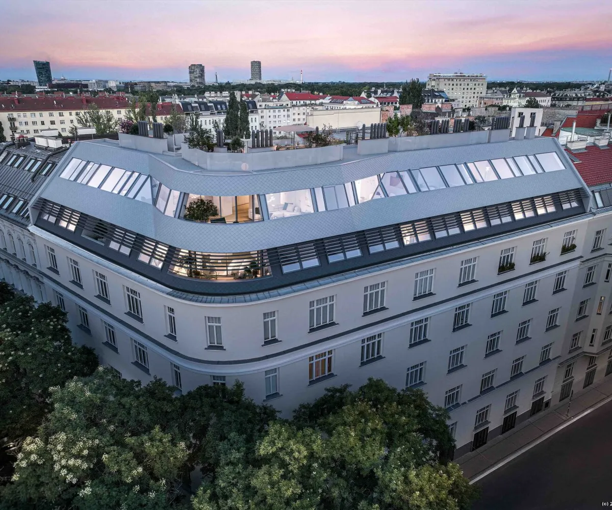 Im neu ausgebauten Dachgeschoss eines sorgfältig revitalisierten Altbaus entstehen 9 exklusive Wohnungen mit 2 bis 5 Zimmern. Jede Wohnung verfügt über mindestens eine private Freifläche, ob Loggia, Balkon oder Terrasse.