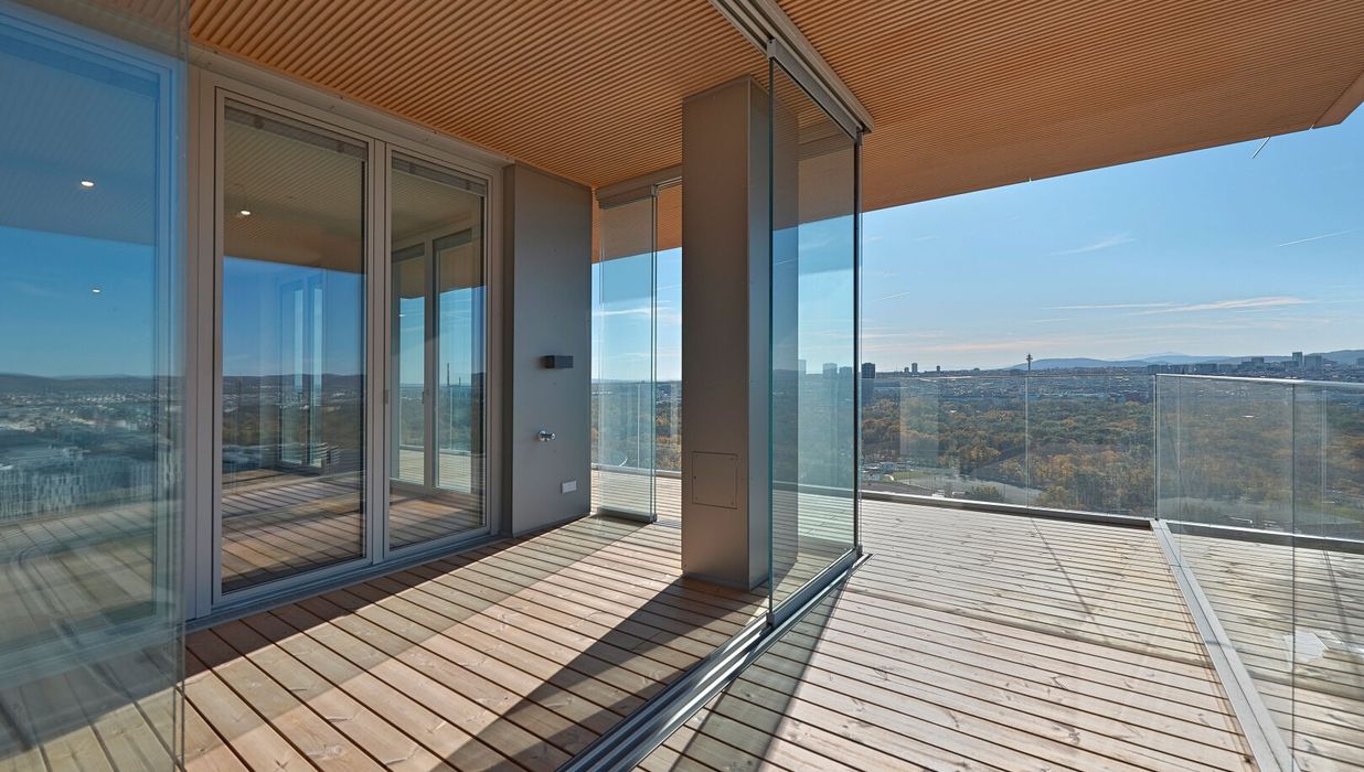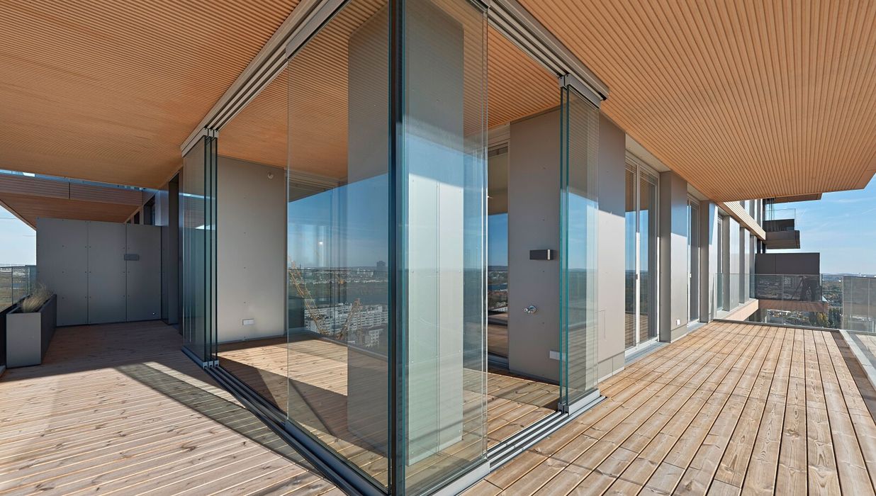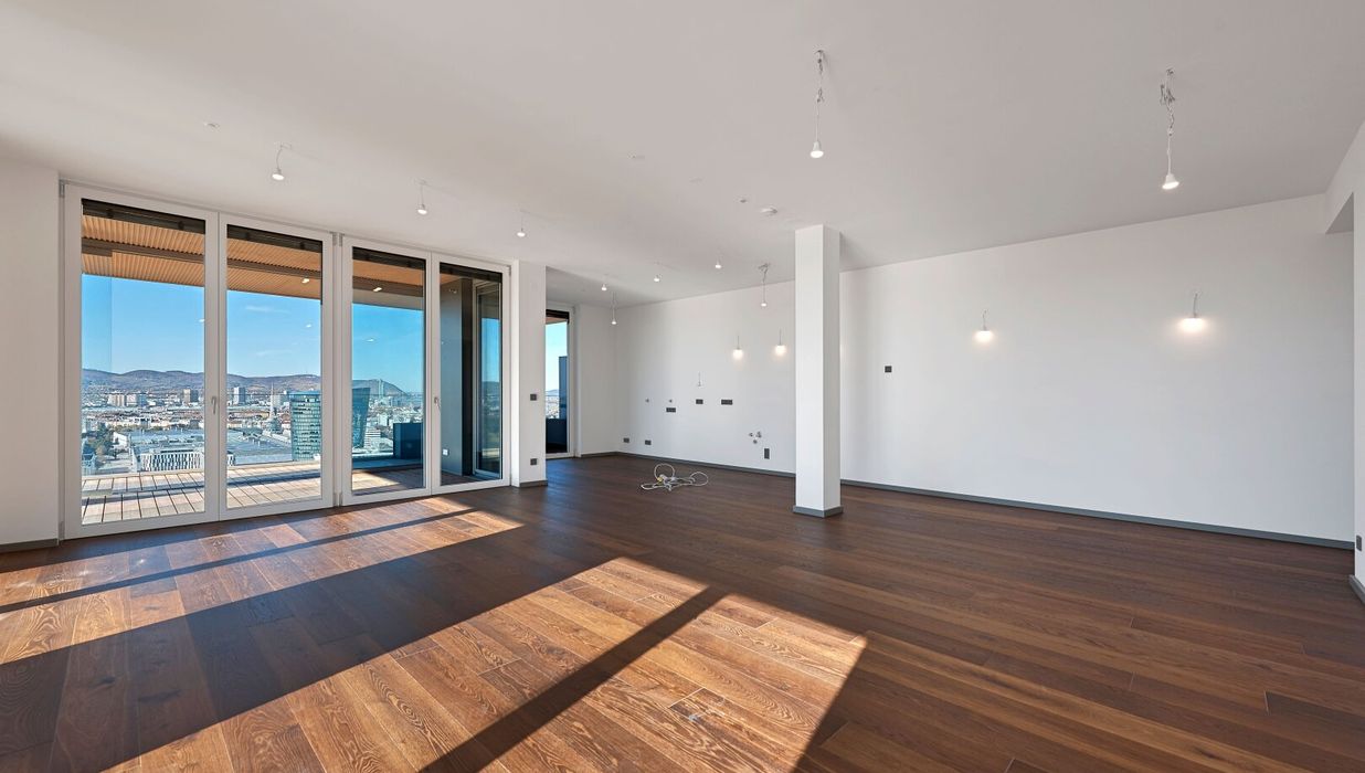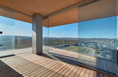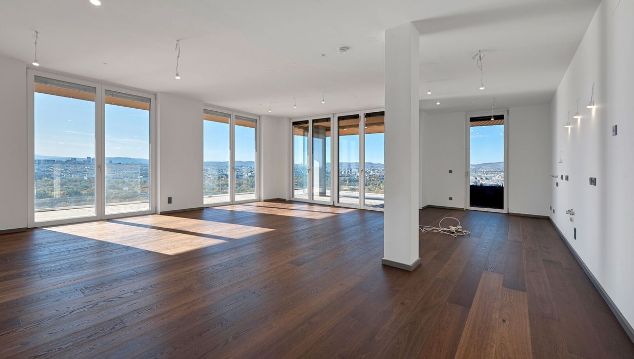 Die Wohnküche mit ca. 57,5 qm bietet insgesamt 5 Ausgänge auf den Balkon bzw. zur verglasten Loggia. Dieser "Wintergarten" bietet Ihnen auch an kühleren Tagen die Möglichkeit, den atemberaubenden Ausblick auf den Prater und über die Stadt zu genießen! Es erwarten Sie optimale Lichtverhältnisse durch die Nordwest- und Südwest-Ausrichtung.