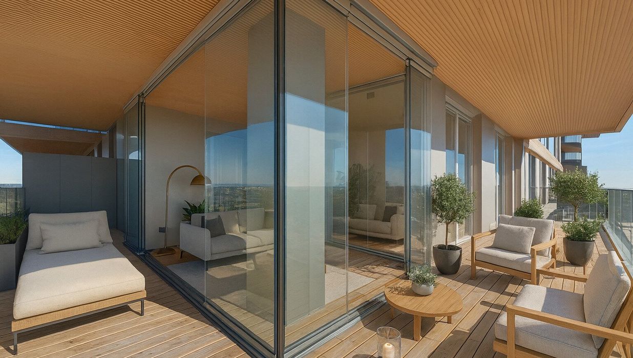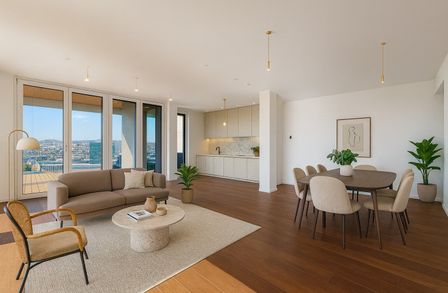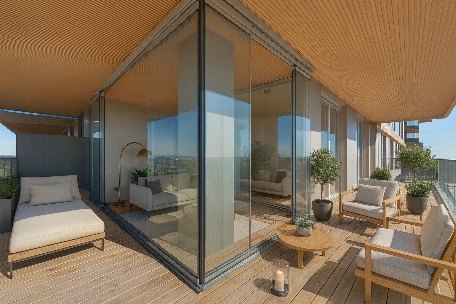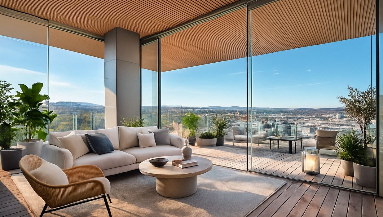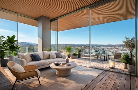 Die Wohnküche mit ca. 57,5 qm bietet insgesamt 5 Ausgänge auf den Balkon bzw. zur verglasten Loggia. Dieser "Wintergarten" bietet Ihnen auch an kühleren Tagen die Möglichkeit, den atemberaubenden Ausblick auf den Prater und über die Stadt zu genießen! Es erwarten Sie optimale Lichtverhältnisse durch die Nordwest- und Südwest-Ausrichtung.
