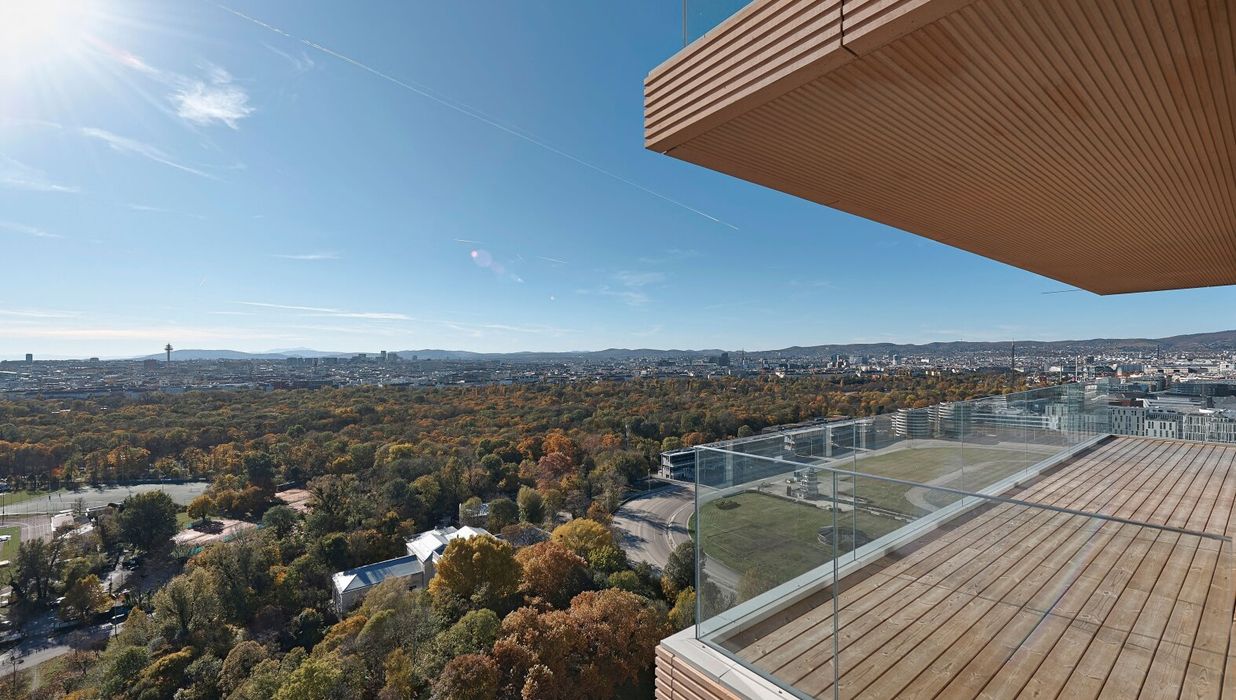 Die Wohnküche mit ca. 57,5 qm bietet insgesamt 5 Ausgänge auf den Balkon. Ein ca. 10 qm großer Bereich des Balkons ist verglast. Dieser Wintergarten bietet Ihnen auch an kühleren Tagen die Möglichkeit, den atemberaubenden Ausblick auf den Prater und über die Stadt zu genießen! Es erwarten Sie optimale Lichtverhältnisse durch die Nordwest- und Südwest-Ausrichtung.