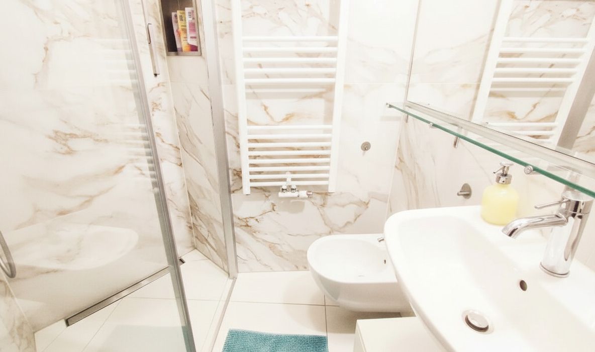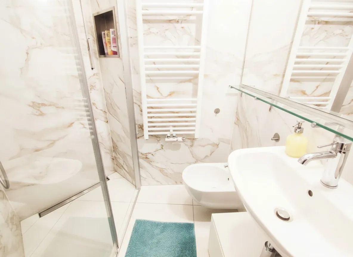 Das geschmackvolle Bad ist mit einer geräumigen Walk-in-Dusche und einem Bidet ausgestattet; die separate Toilette verfügt über ein Handwaschbecken.