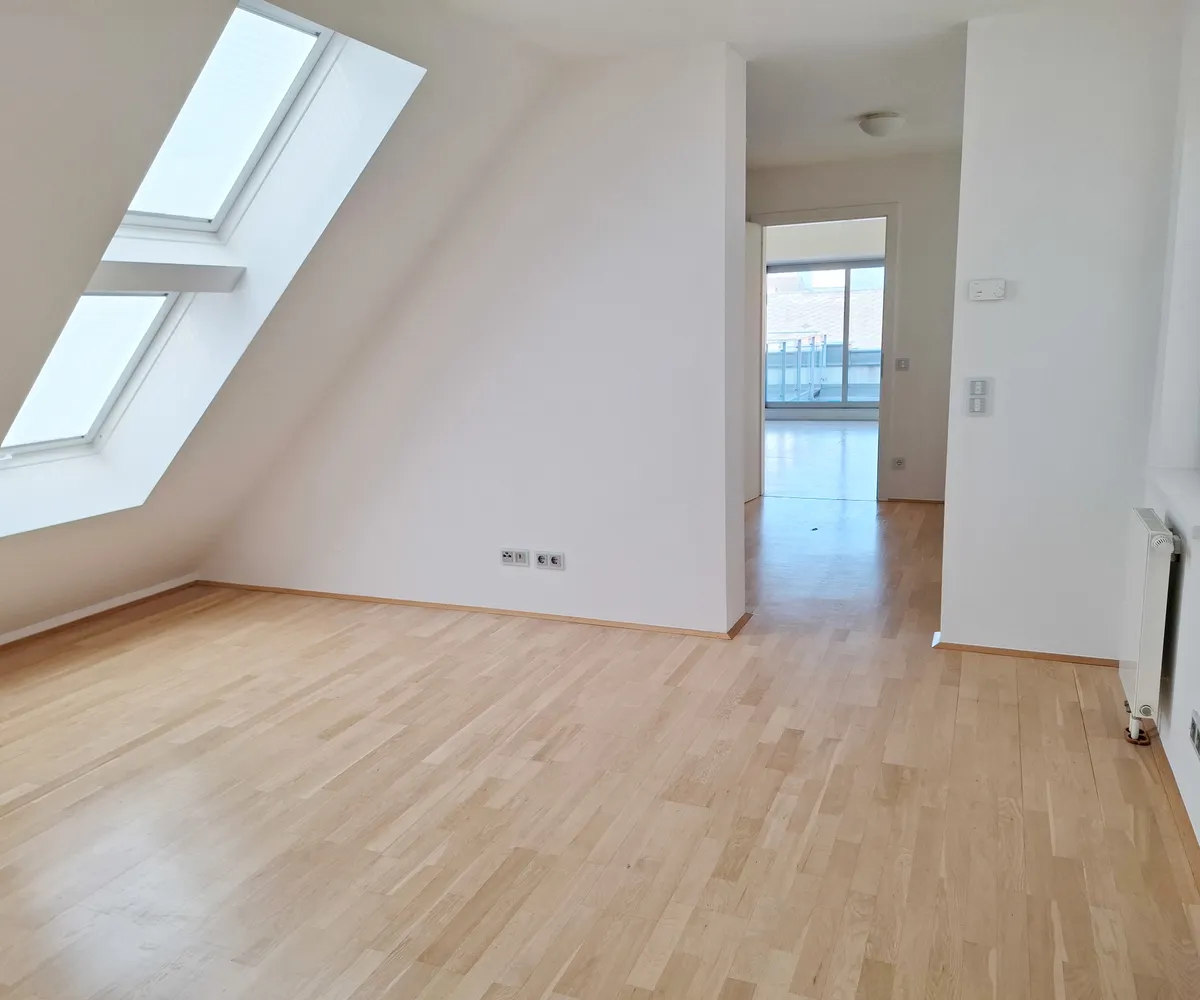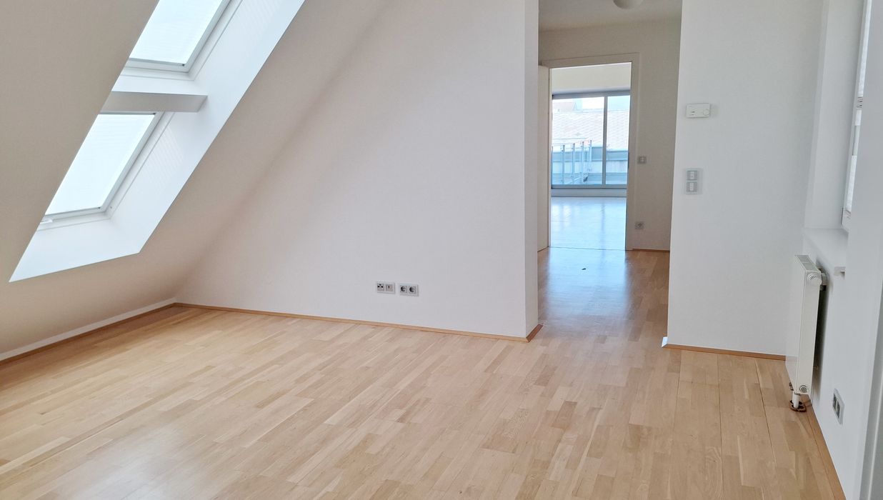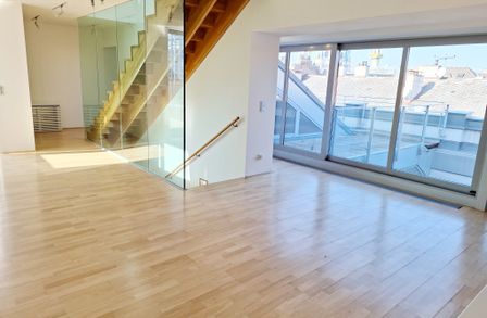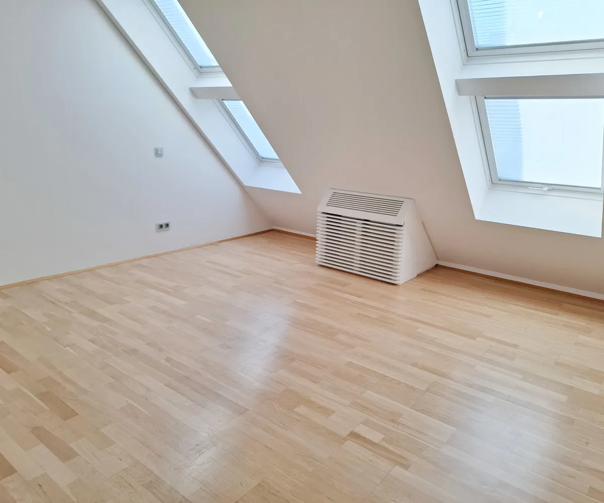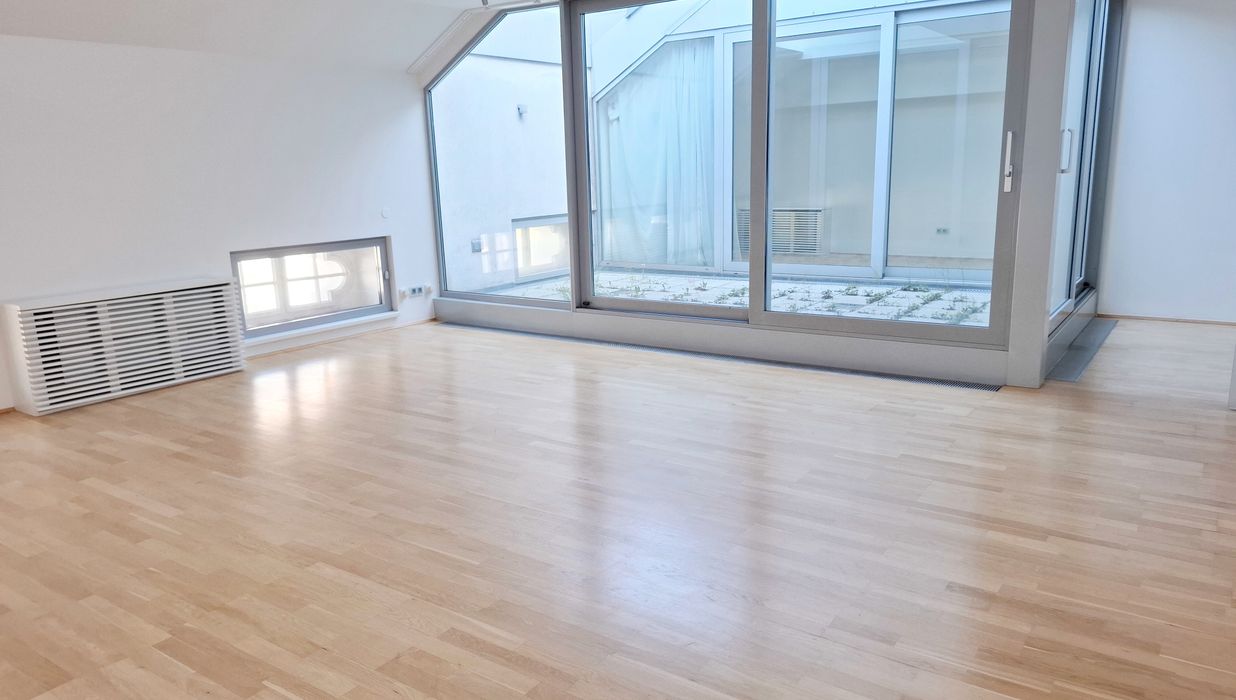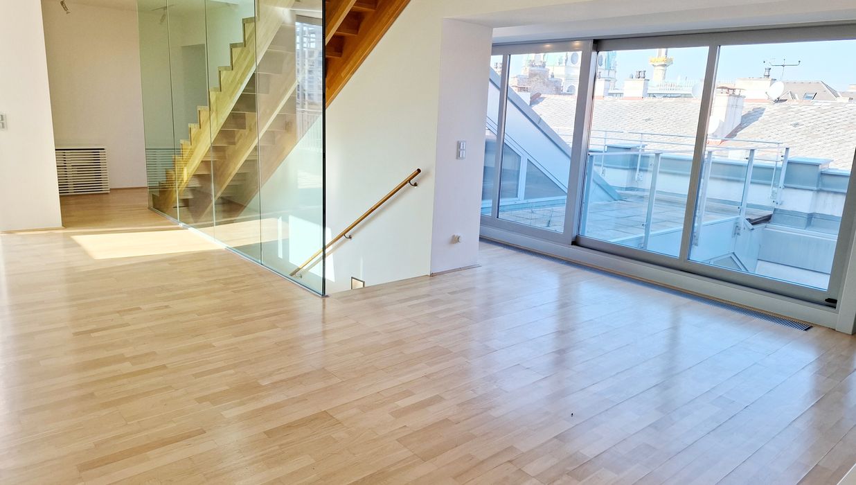 Ein großzügiger Eingangsbereich empfängt Sie im 1. Dachgeschoß. Der lichtdurchflutete, über 77 m² große Wohnbereich teilt sich durch die Stiege ins 2. Dachgeschoß in eine moderne, hochwertig ausgestattete Küche samt großzügigem Essbereich und den Wohnbereich, der eine wunderschöne Aussicht zur Schwindgasse und somit zur Kuppel der Karlskirche hin bietet. Zwischen dem Wohnbereich und dem ersten Zimmer befindet sich ein Lichtatrium.