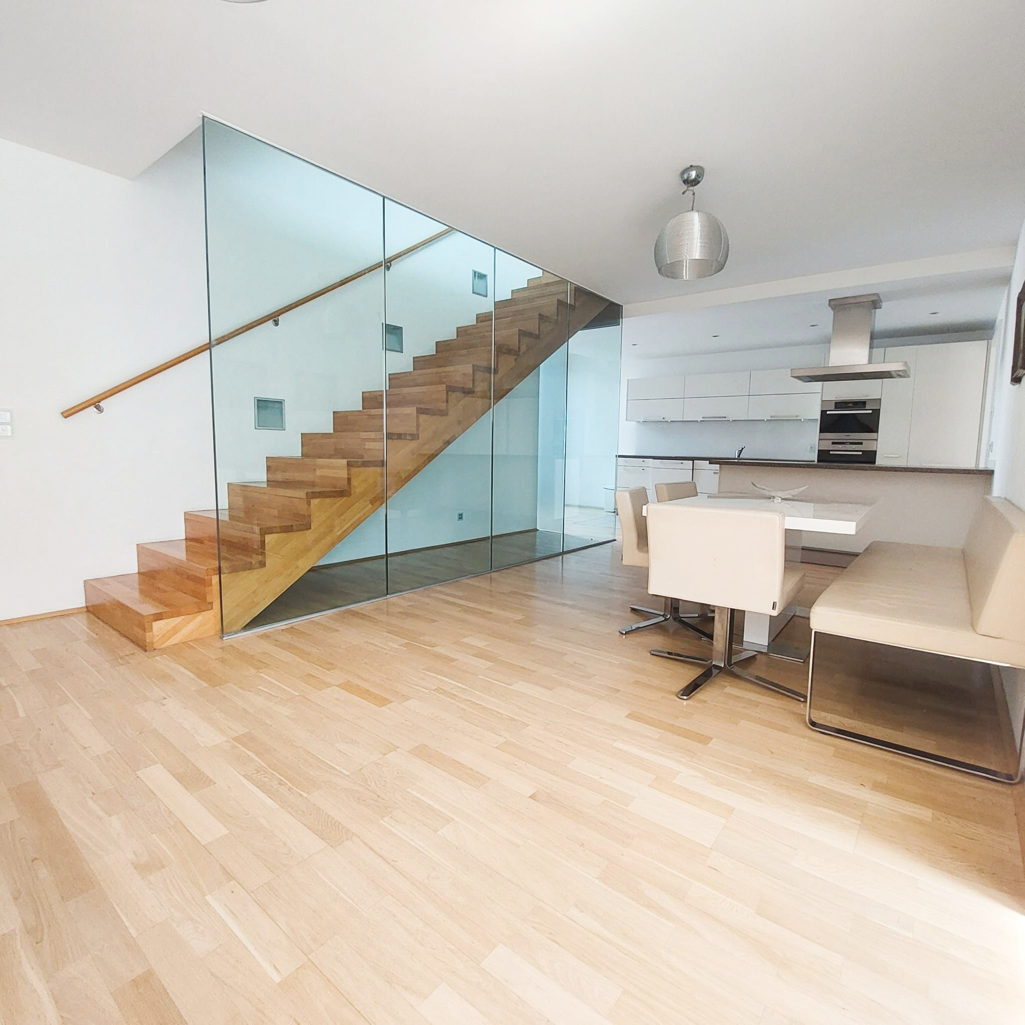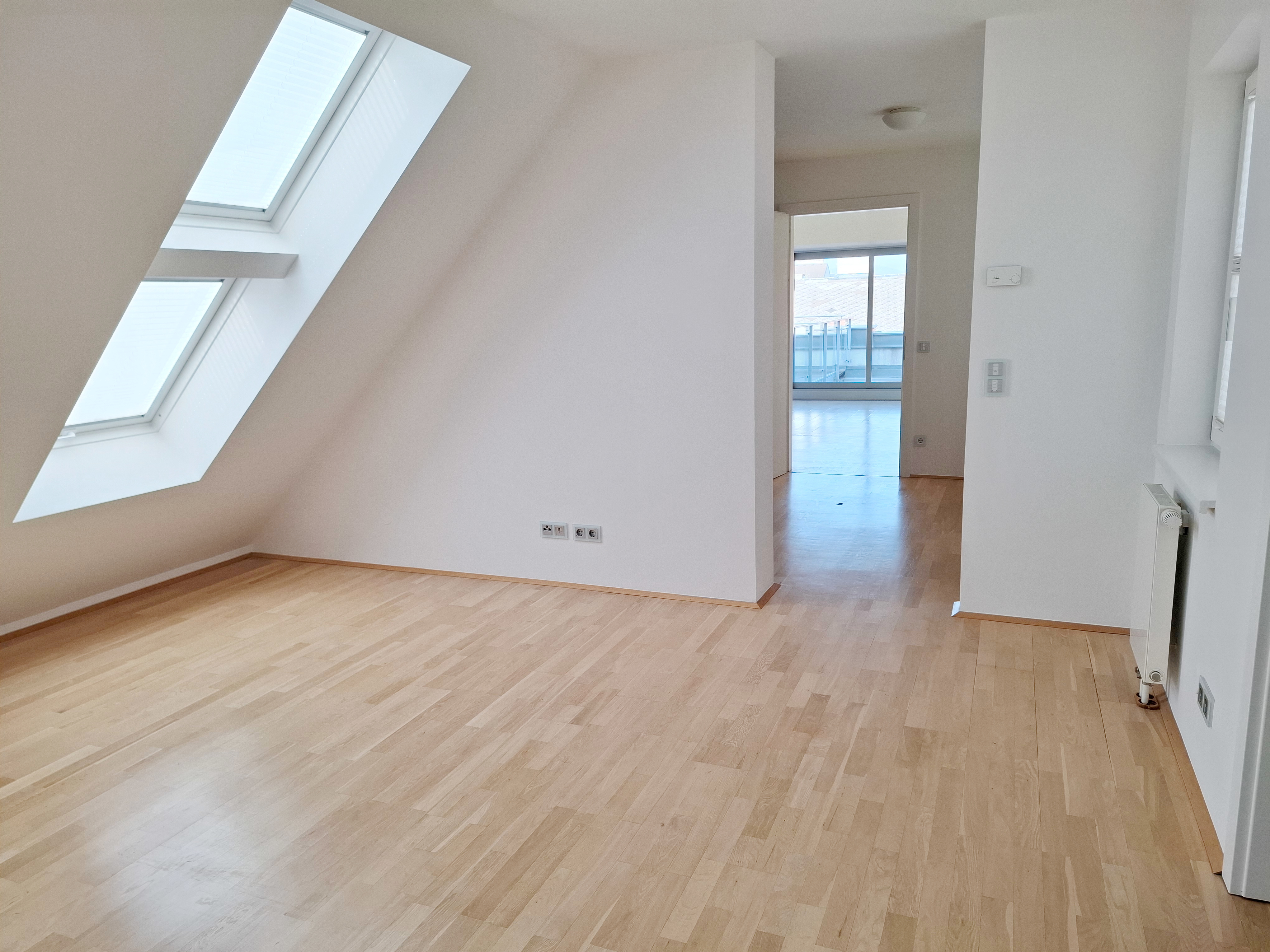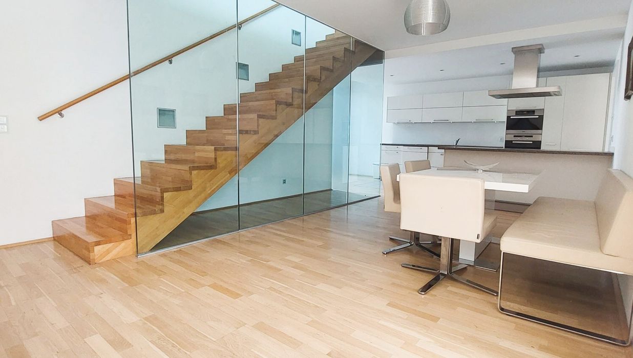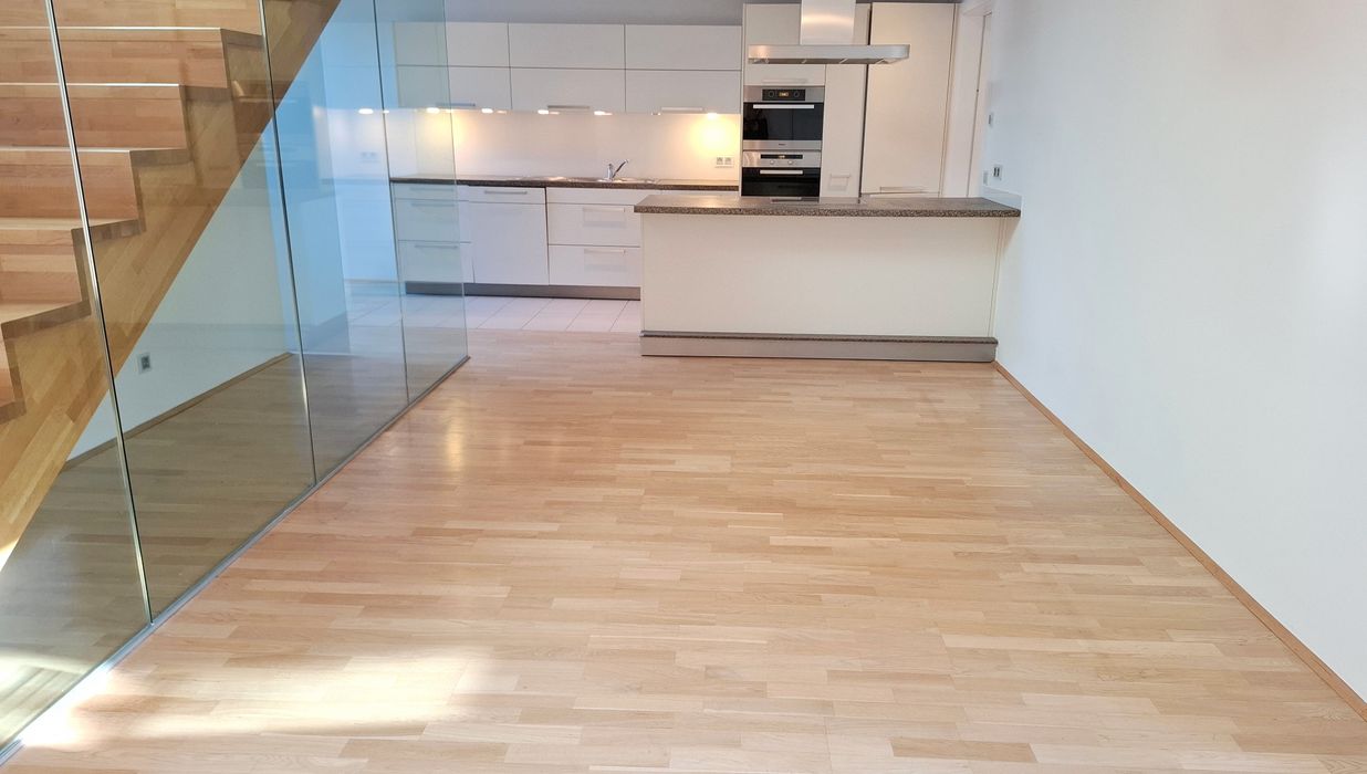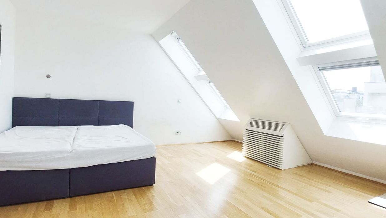 Ein großzügiger Eingangsbereich empfängt Sie im 1. Dachgeschoß. Der lichtdurchflutete, über 77 m² große Wohnbereich teilt sich durch die Stiege ins 2. Dachgeschoß in eine moderne, hochwertig ausgestattete Küche samt großzügigem Essbereich und den Wohnbereich, der eine wunderschöne Aussicht zur Schwindgasse und somit zur Kuppel der Karlskirche hin bietet. Zwischen dem Wohnbereich und dem ersten Zimmer befindet sich ein Lichtatrium.