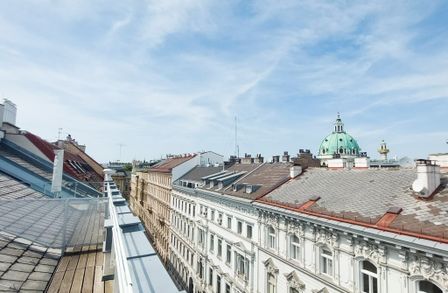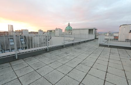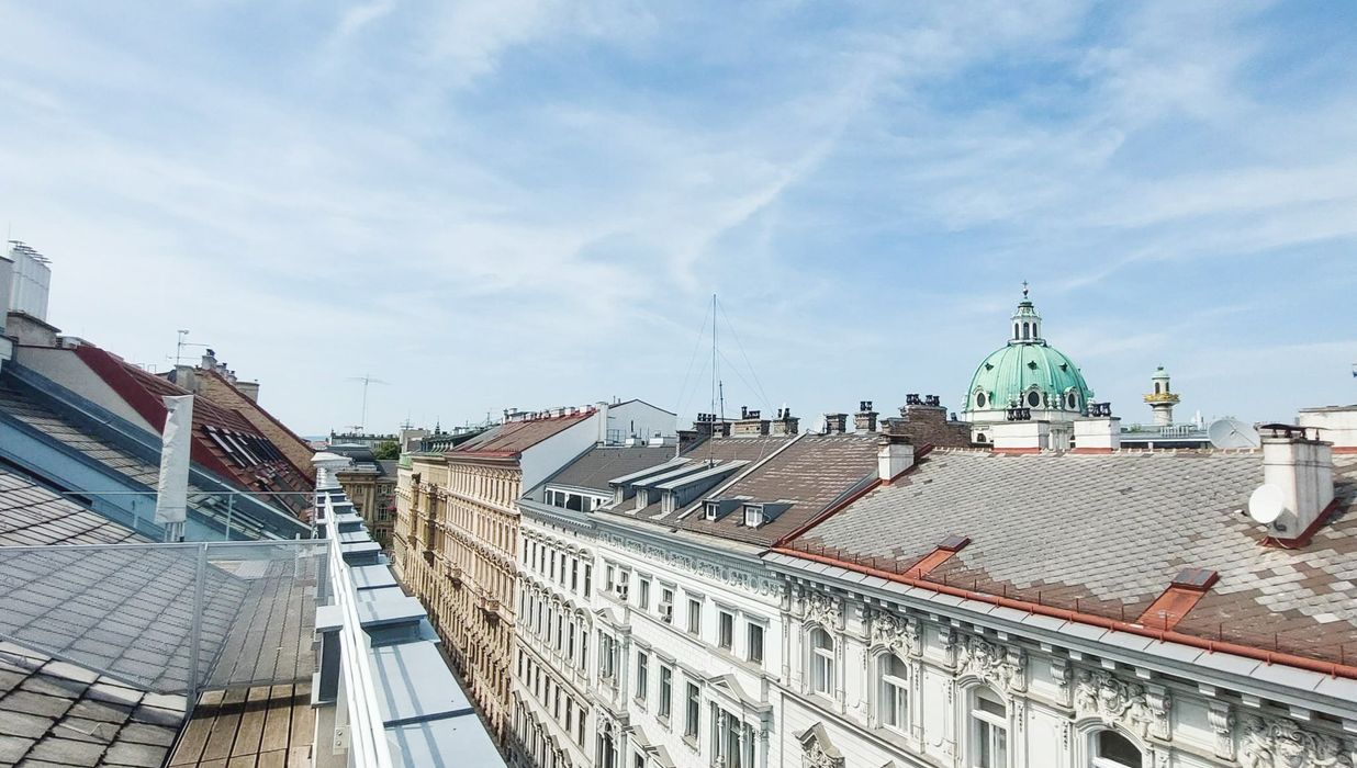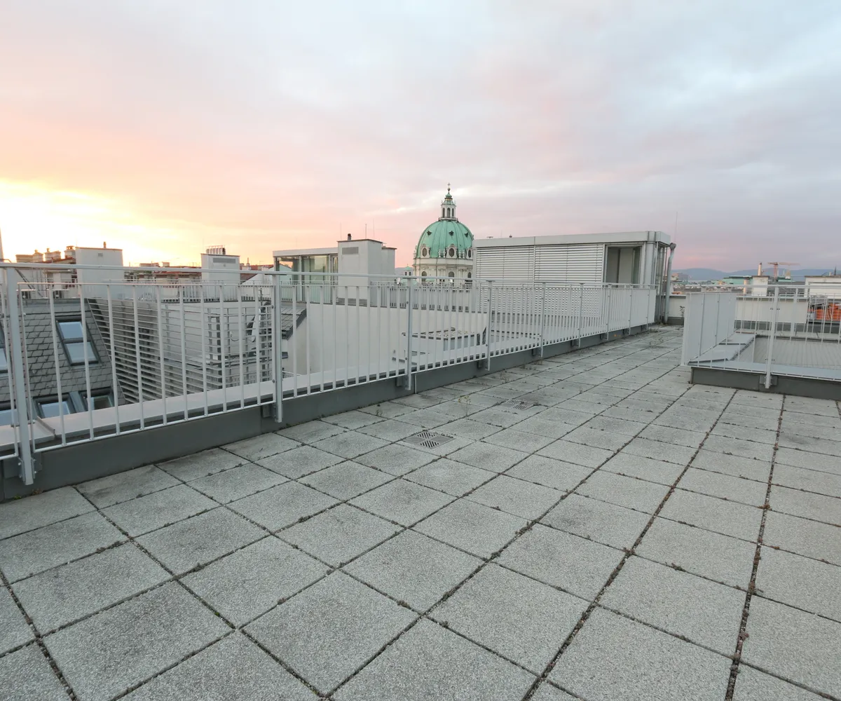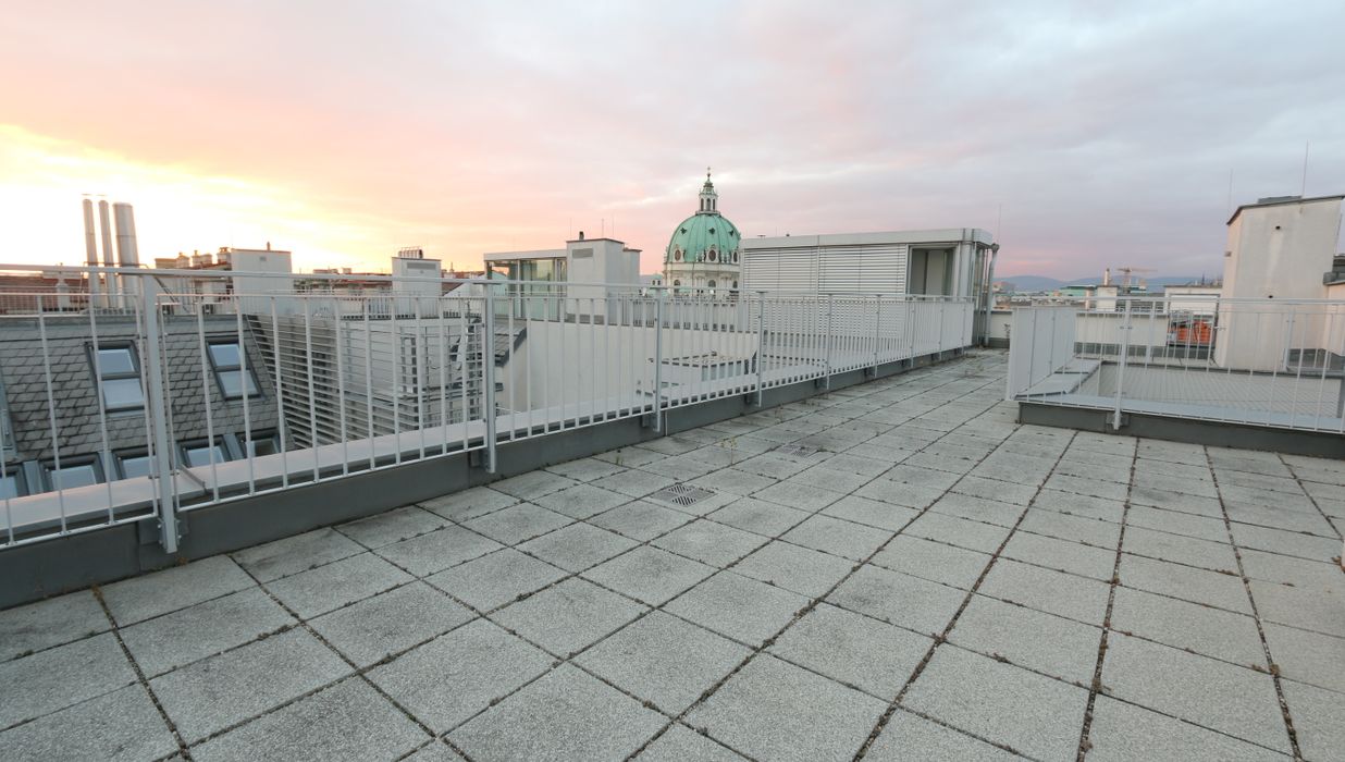 Ein weiteres Highlight ist die großzügige, etwa 52 m² große Dachterrasse, eine Etage höher, die schöne Momente verspricht wie etwa stimmungsvolle Sonnenuntergänge oder einen Blick auf die wunderschöne Karlskirche im Abendlicht.