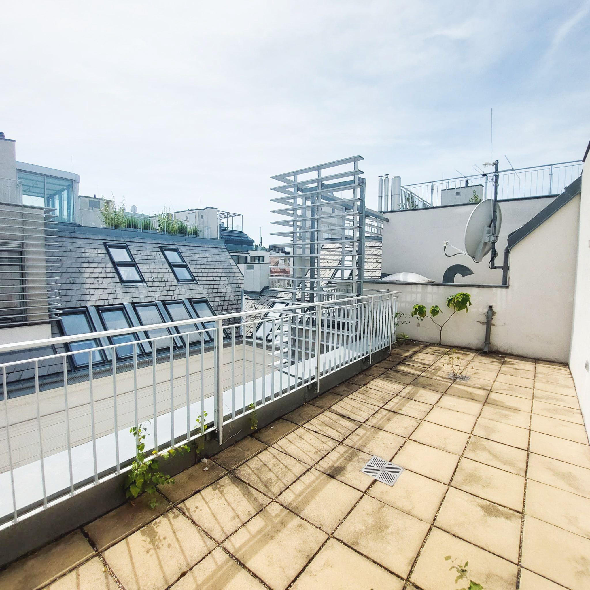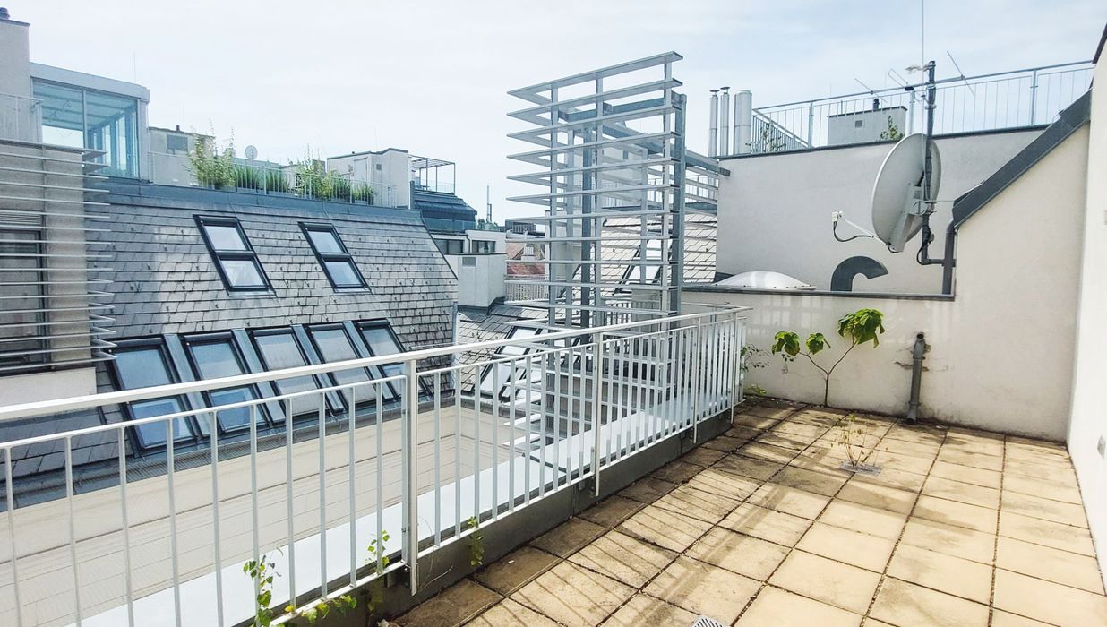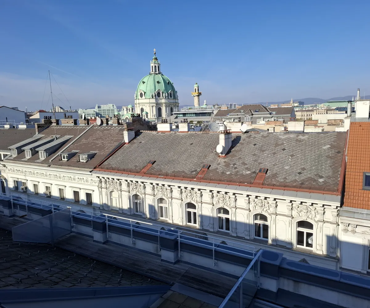 Ein weiteres Highlight ist die großzügige, etwa 52 m² große Dachterrasse, eine Etage höher, die schöne Momente verspricht wie etwa stimmungsvolle Sonnenuntergänge oder einen Blick auf die wunderschöne Karlskirche im Abendlicht.