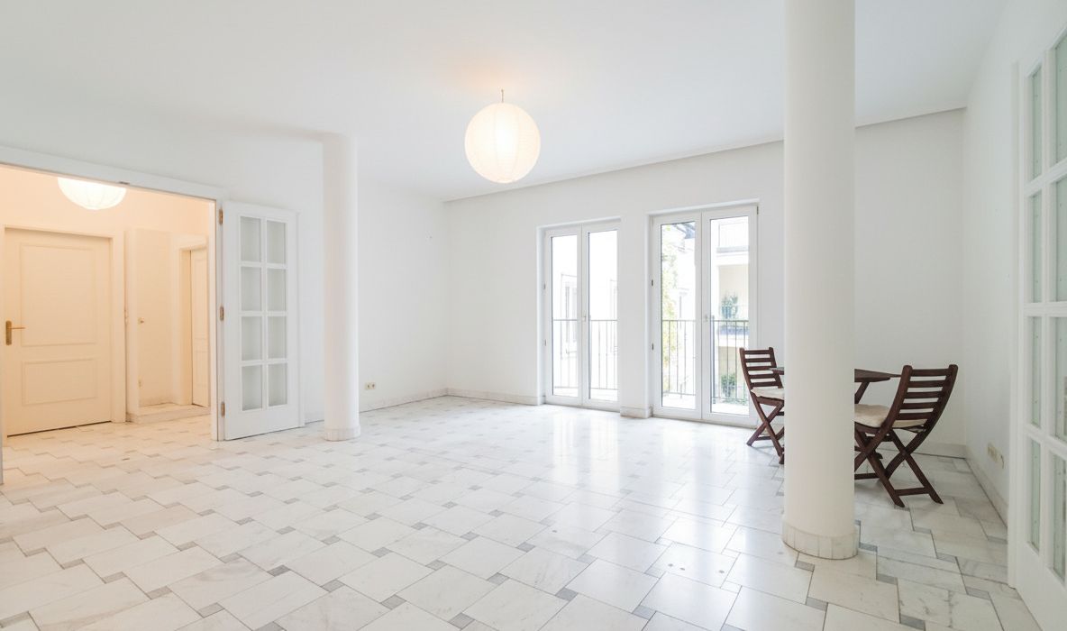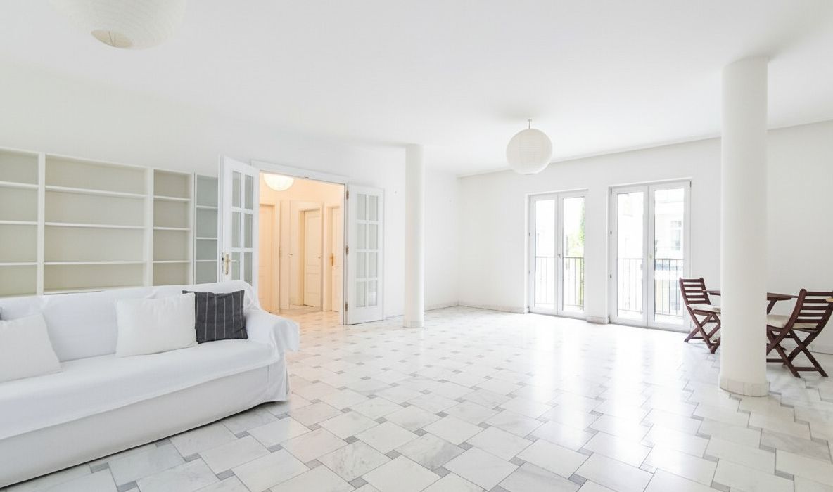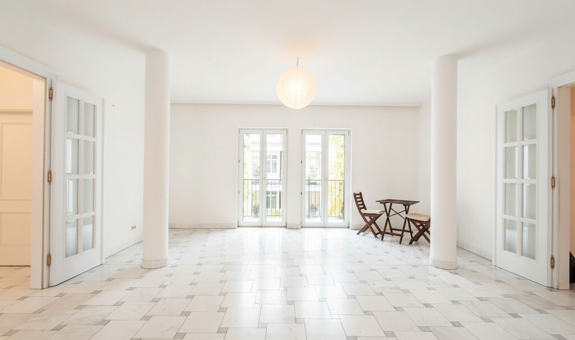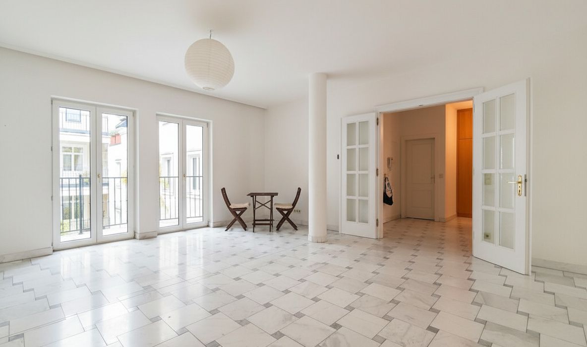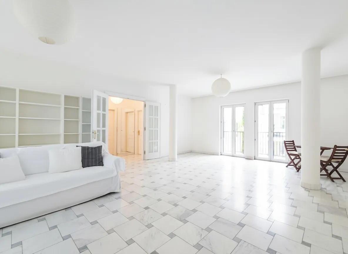 Die Wohnung überzeugt durch ihre Großzügigkeit und Offenheit – lichtdurchflutete Räume mit klassisch eleganten Flügeltüren und hellen Marmorböden schaffen ein beeindruckendes Raumgefühl und unterstreichen die ruhige, klare Atmosphäre.