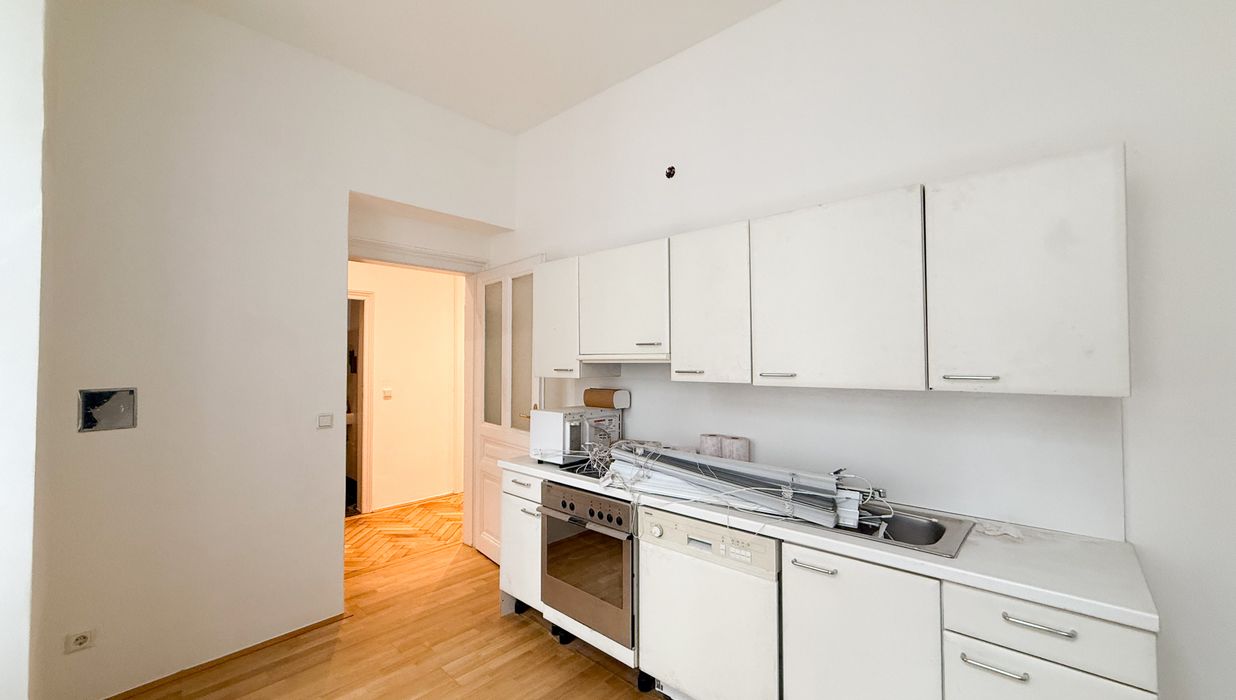 Die Zimmer sind angenehm proportioniert und flexibel nutzbar – sowohl als Wohn- und Schlafräume als auch als Arbeits- oder Gästezimmer. Die separat angeordnete Küche ermöglicht eine klare Trennung zwischen Wohn- und Kochbereich und fügt sich funktional in den Grundriss ein.