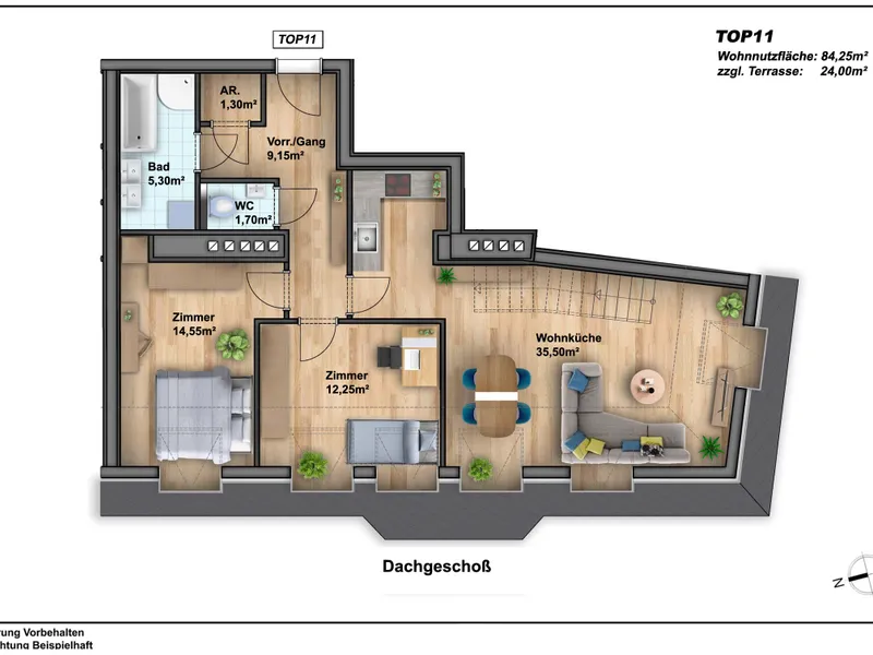 Auf einer Wohnfläche von ca. 84,3 m² erstrecken sich die folgenden Räumlichkeiten: