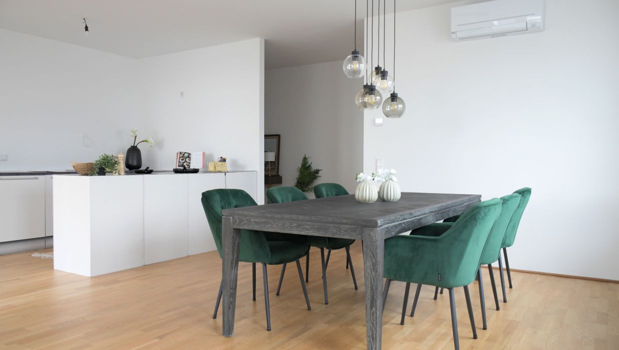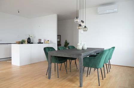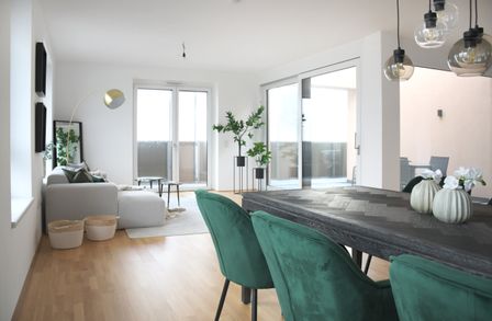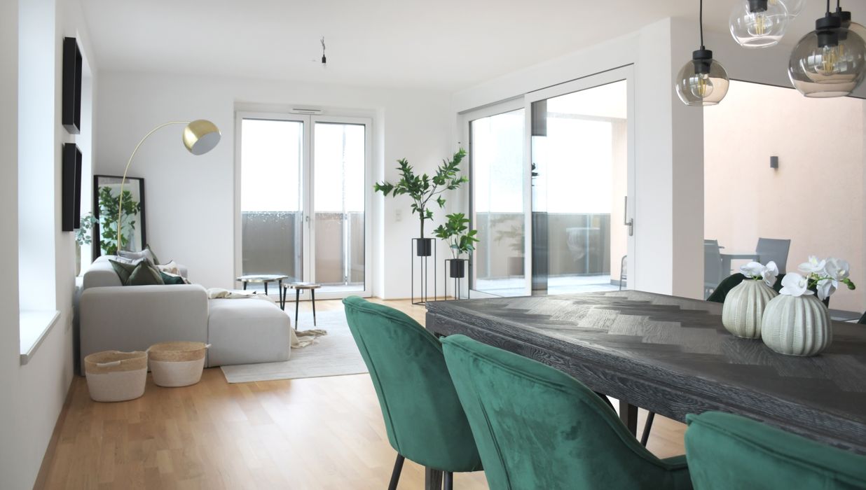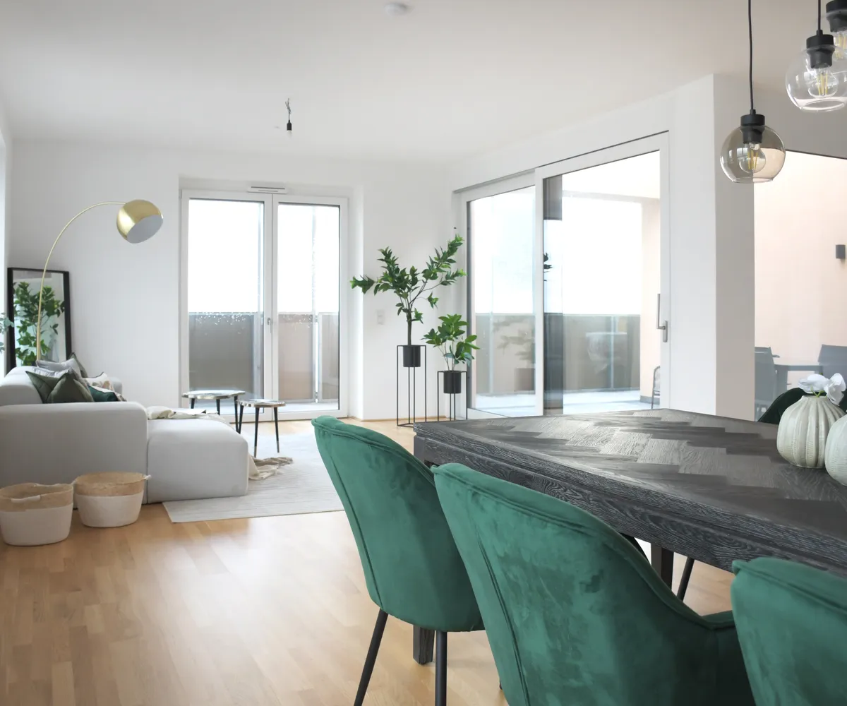 Diese ca. 110 m² große 3-Zimmer-Wohnung vereint den perfekten Grundriss mit modernem Wohngefühl. Ein offener Wohn- und Essbereich mit großer Wohnküche bildet das Herzstück. Großzügig, hell und ideal für gemeinsame Familienzeit oder gemütliche Abende mit Freunden. Zwei Schlafzimmer bieten Rückzugsorte und Privatsphäre. Dazu kommen zwei Bäder, zwei WCs, Abstellraum und Garderobe – perfekt für das tägliche Leben mit Stil und Struktur. Und natürlich: alles zentral begehbar. Panorama Wohnung mit architektonischem Highlight.