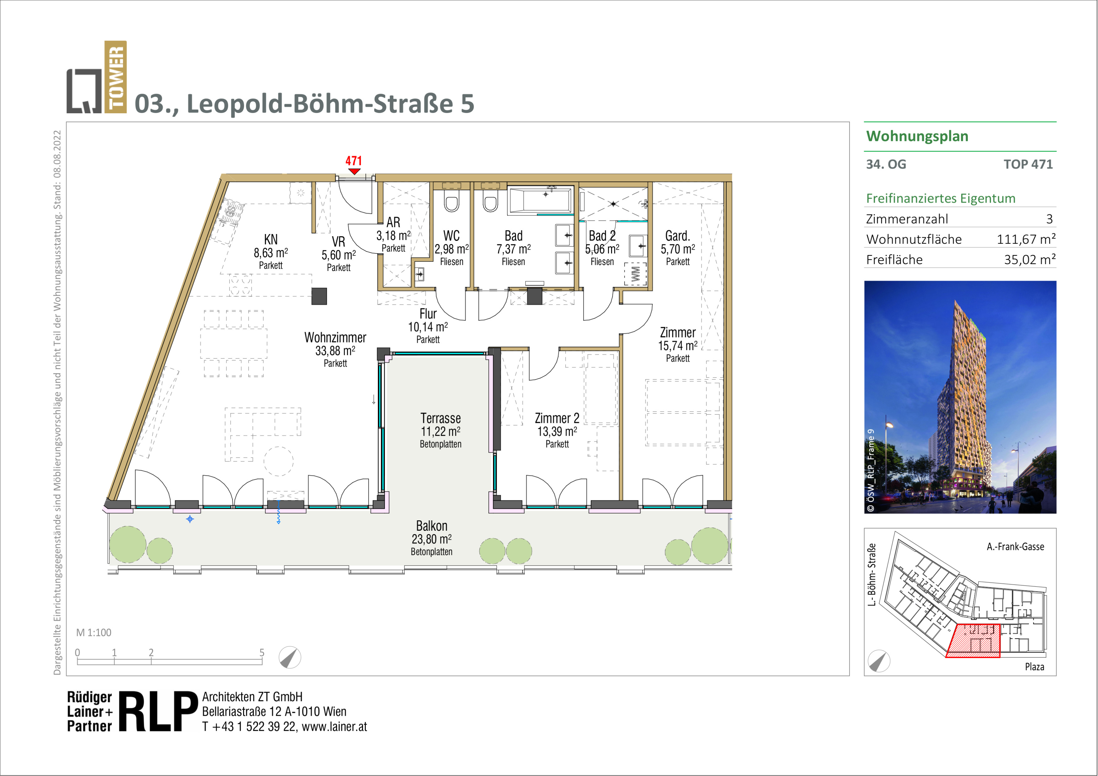 Diese ca. 112 m² große 3-Zimmer-Wohnung vereint den perfekten Grundriss mit modernem Wohngefühl. Ein offener Wohn- und Essbereich mit großer Wohnküche bildet das Herzstück. Großzügig, hell und ideal für gemeinsame Familienzeit oder gemütliche Abende mit Freunden. Zwei Schlafzimmer bieten Rückzugsorte und Privatsphäre. Dazu kommen zwei Bäder, zwei WCs, Abstellraum und Garderobe – perfekt für das tägliche Leben mit Stil und Struktur. Und natürlich: alles zentral begehbar. Panorama Wohnung mit architektonischem Highlight.