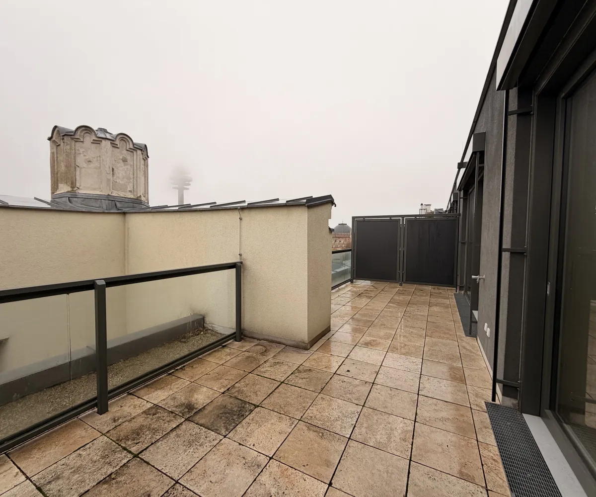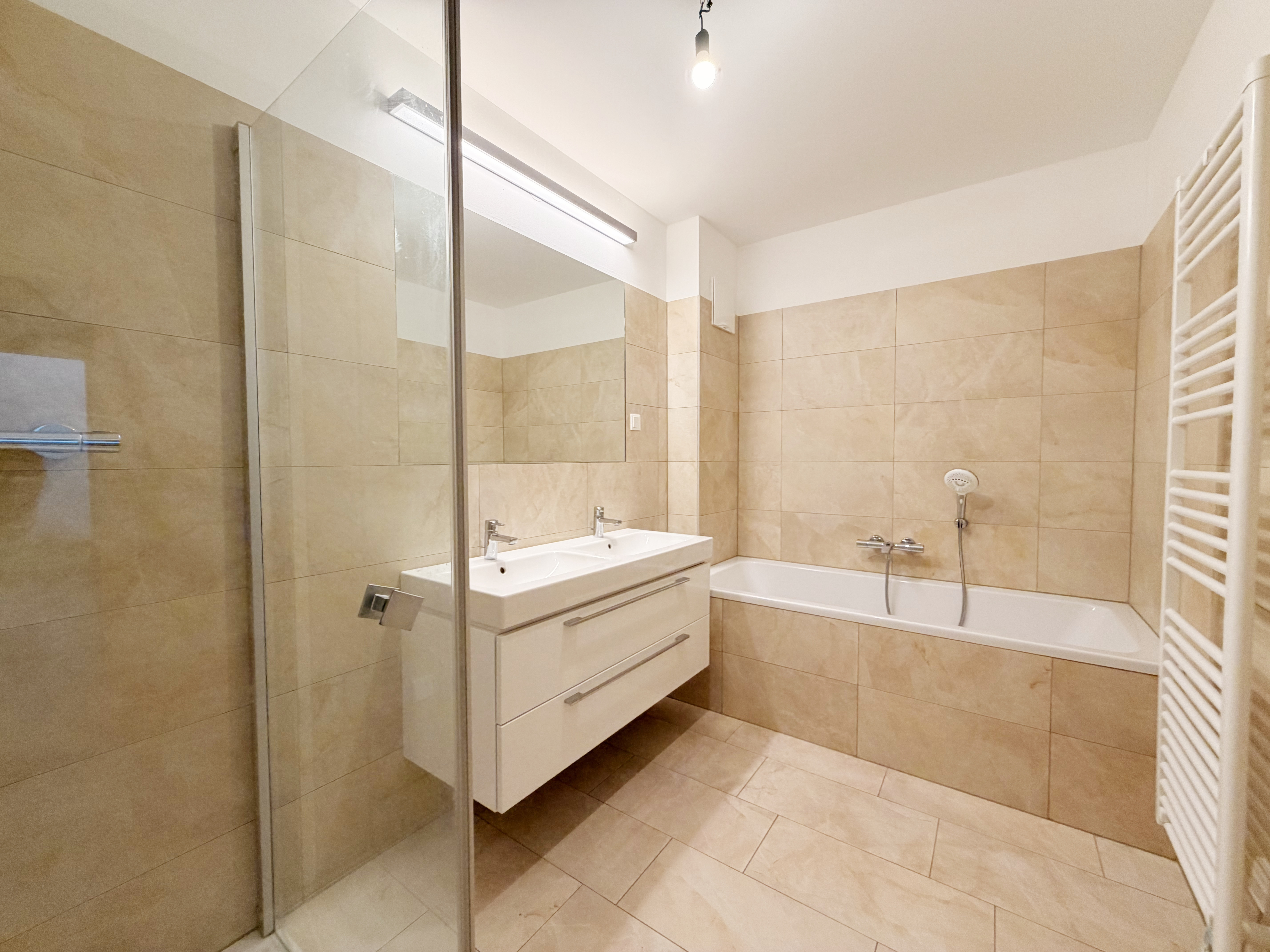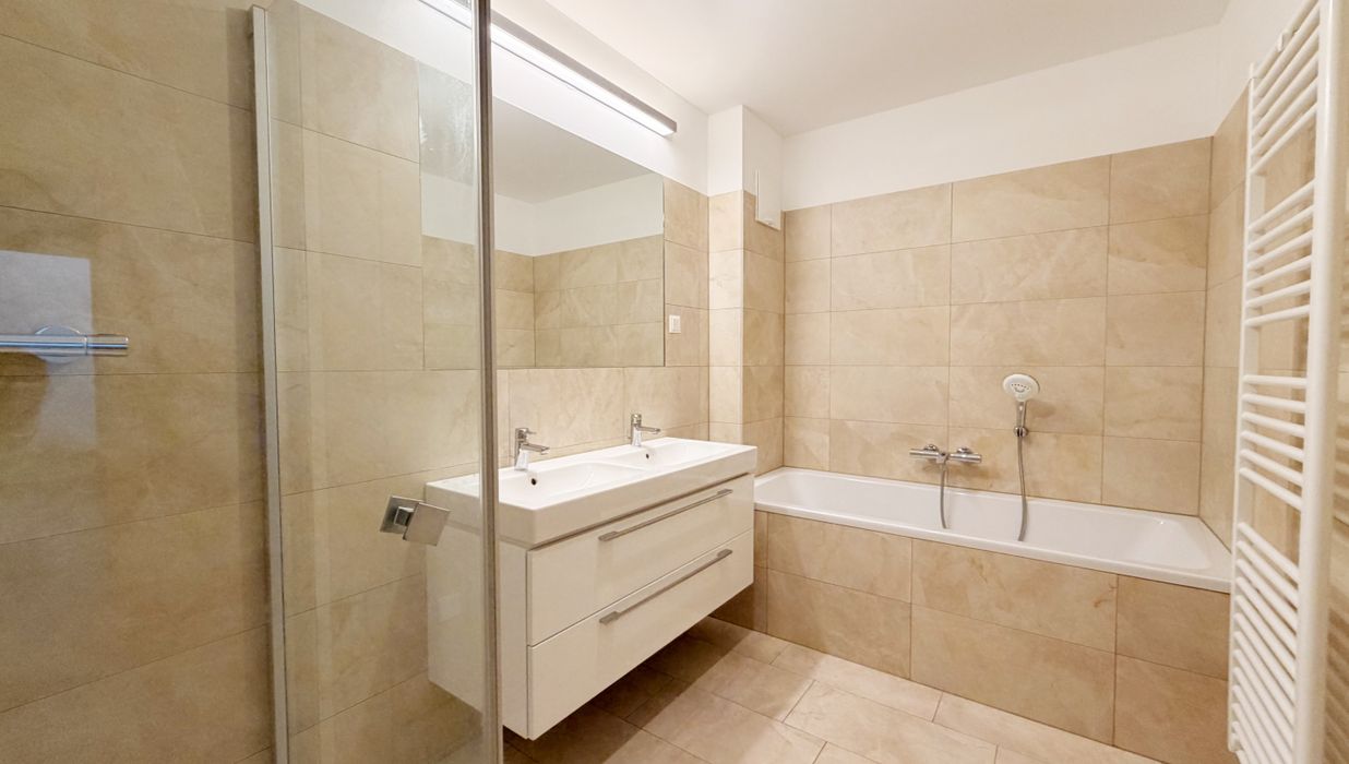 Die Wohnung streckt sich über das 1. und 2. Dachgeschoss und verfügt über eine großzügige Wohnküche mitt Essbereich, drei Schlafzimmer, ein Badezimmer mit Badewanne und Waschmaschinenanschluss, ein weiteres Badezimmer mit Dusche, Badewanne und Doppelhandwaschbecken, zwei separates WC, sowie einen Abstell- und Vorraum.