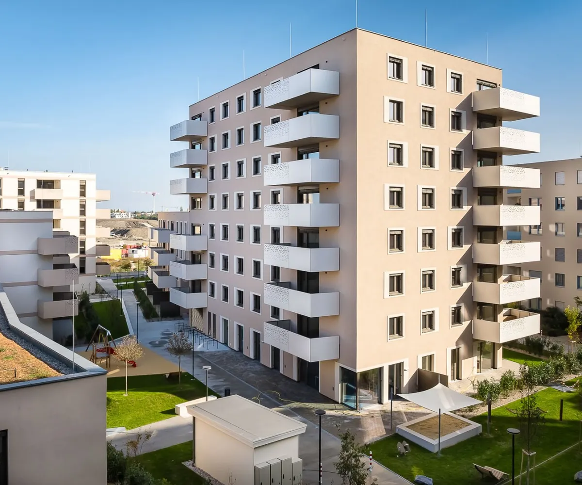 In der Donaustadt entsteht ein besonders attraktives Stadtquartier mit Wohnungen, Geschäften, Lokalen, Freiraum und zahlreichen Gemeinschafts- und Mobilitätsangeboten. Auch die Natur kommt nicht zu kurz, denn in unmittelbarer Nähe befindet sich der Badeteich Hirschstetten sowie die gleichnamigen, weitläufigen Blumengärten. Hinsichtlich der öffentlichen Anbindung gibt es zahlreiche Optionen: Die U2 (Haltestelle Hausfeldstraße) erreicht man fußläußig innerhalb von zehn Minuten. Die Haltestelle der Straßenbahn-Linie Prinzgasse ist 350 Meter entfernt; die Buslinien 85A und 95 A (Haltestelle Pirquetgasse) 150 Meter. In 300 bzw. 350 Metern Entfernung befinden sich die Buslinien 95B und 97 A (Haltestelle Zanggasse). Und wer mag, ist innerhalb von 20 Minuten in der Wiener Innenstadt.