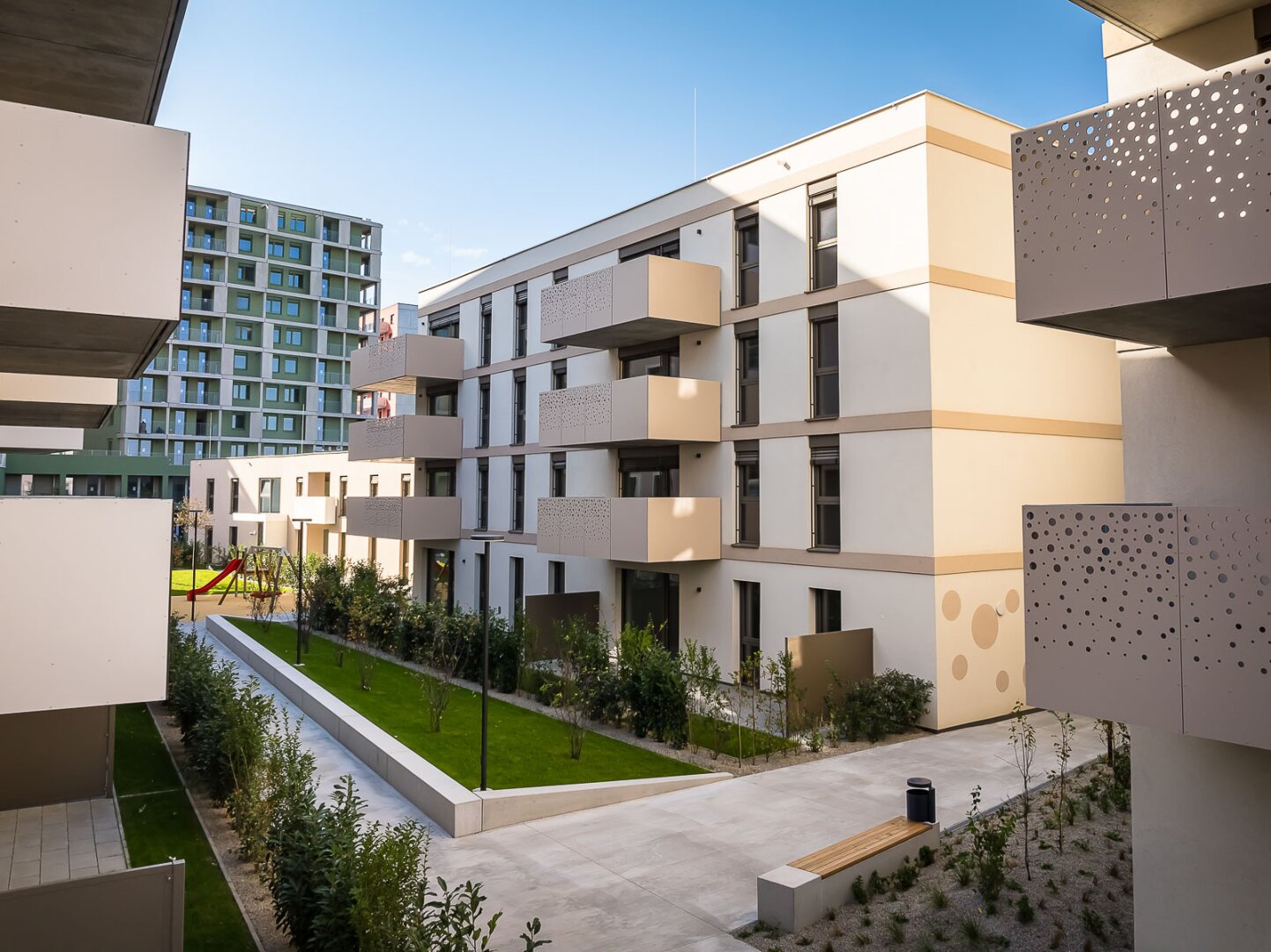 Am ruhigen, grünflächigen Rand des neuen Stadtquartiers gelegen, entsteht „Gretls Garten“: Bei dem Wohnobjekt mit 118 frei finanzierten Eigentumswohnungen ist der Name Programm, denn die großzügigen Wohneinheiten verfügen alle über Freiflächen: Neben Balkonen, Loggien und Terrassen besteht auch die Möglichkeit, eine Eigentumswohnung mit einem kleinen aber feinem Eigengarten zu erwerben.