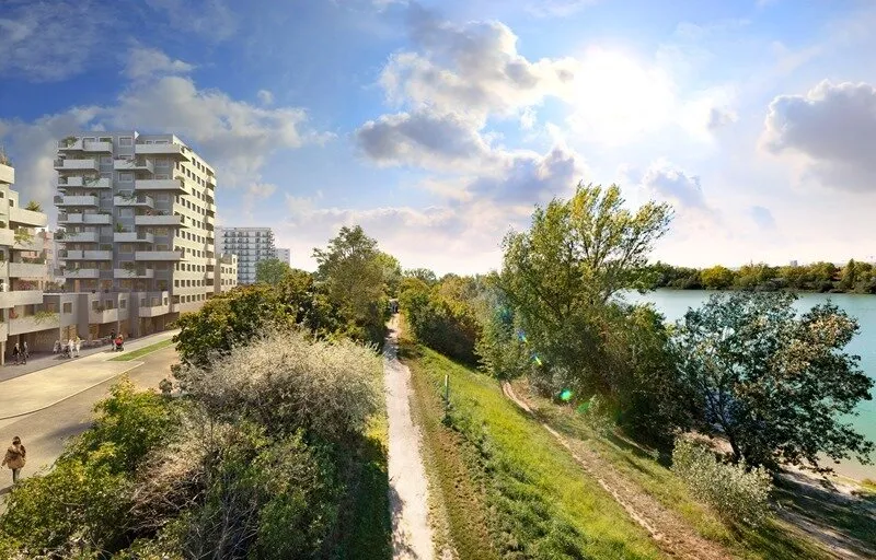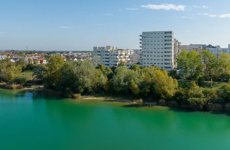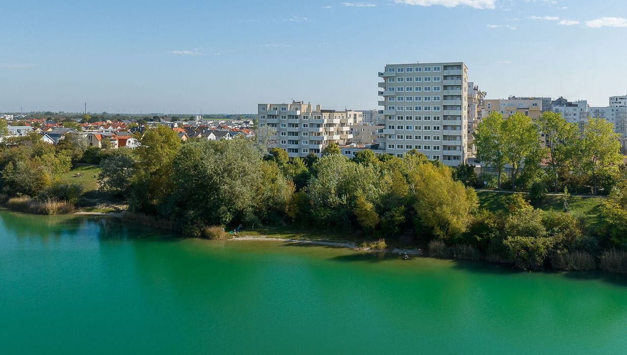 Direkt beim Hirschstettner Badesee entstehen 99 freifinanzierte Eigentumswohnungen. Neben dem idyllischen Badeteich mit Erholungsmöglichkeiten und Spielplätzen rund um den Teich bietet das neue Stadtgebiet grundlegende Einrichtungen zur Nahversorgung. Die Gebäude zeichnen sich durch eine Höhenstaffelung in vier vorgegebenen Bauklassen mit zwei bis maximal elf Geschoßen aus. Auf diese Weise wird eine ausreichende Belichtung der Gebäude und des Freiraums gewährleistet. Bei der Planung haben wir auch an Selbstversorger gedacht: bestehende Gewächshäuser sollen gemeinschaftlich genutzt werden. Ein großer Anteil der Dachflächen pro Bauplatz werden begrünt und auch begehbar sein.