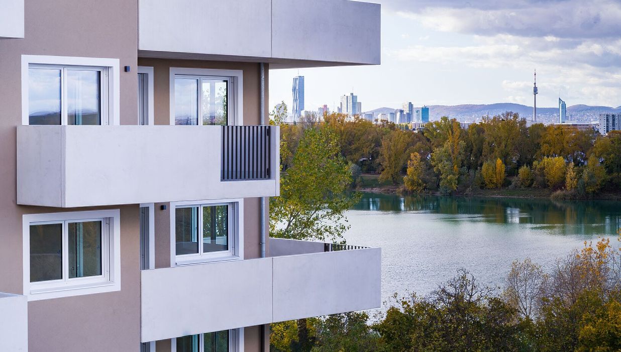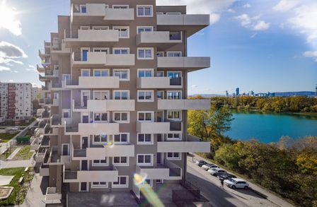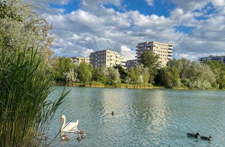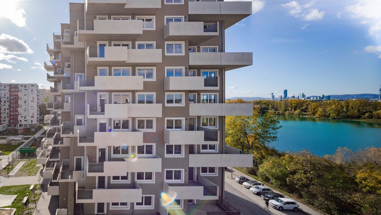 Direkt beim Hirschstettner Badesee entstehen 99 freifinanzierte Eigentumswohnungen. Neben dem idyllischen Badeteich mit Erholungsmöglichkeiten und Spielplätzen rund um den Teich bietet das neue Stadtgebiet grundlegende Einrichtungen zur Nahversorgung. Die Gebäude zeichnen sich durch eine Höhenstaffelung in vier vorgegebenen Bauklassen mit zwei bis maximal elf Geschoßen aus. Auf diese Weise wird eine ausreichende Belichtung der Gebäude und des Freiraums gewährleistet. Bei der Planung haben wir auch an Selbstversorger gedacht: bestehende Gewächshäuser sollen gemeinschaftlich genutzt werden. Ein großer Anteil der Dachflächen pro Bauplatz werden begrünt und auch begehbar sein.