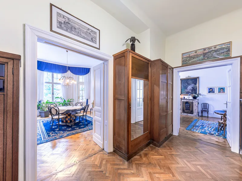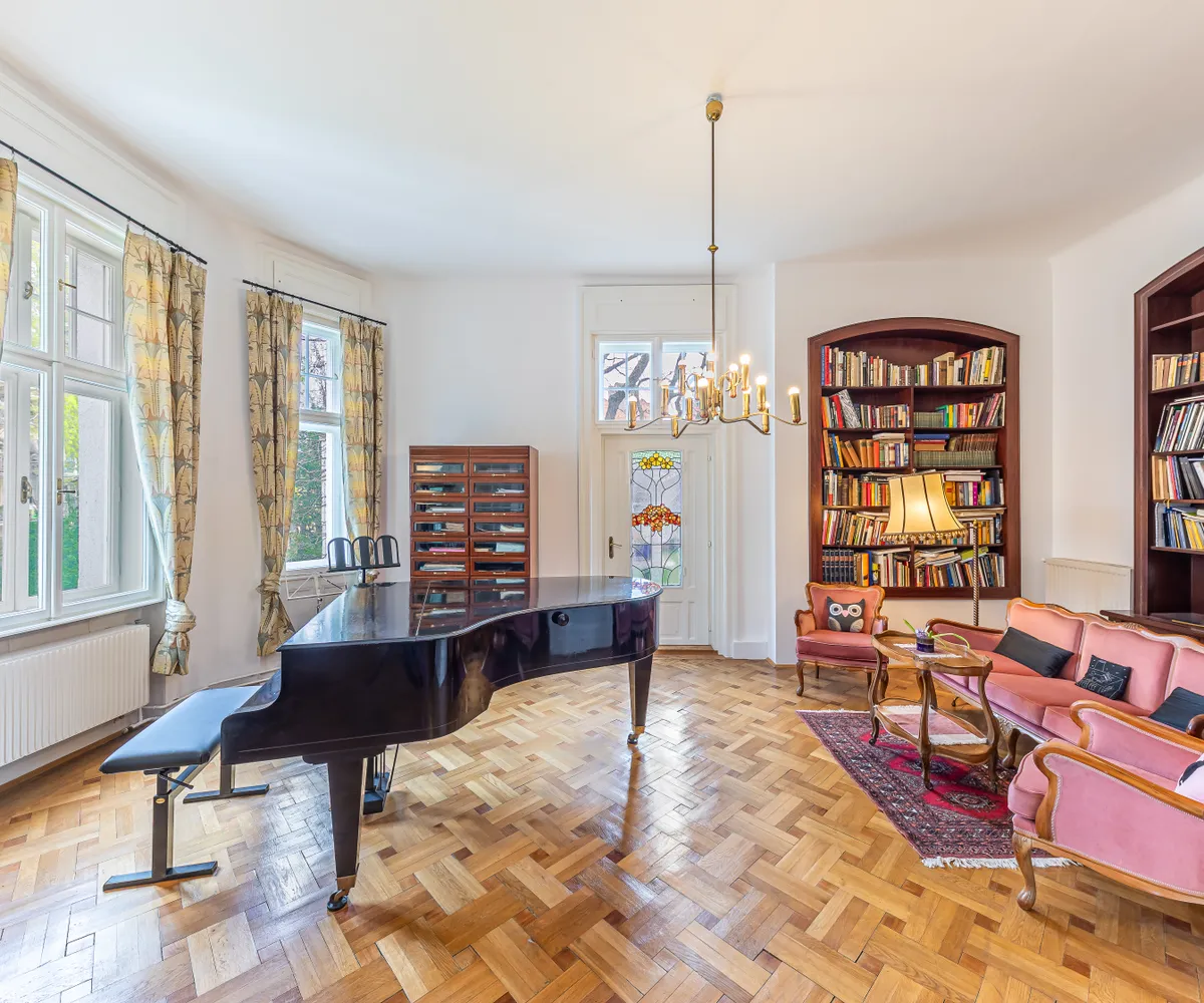 Der angrenzende Ess- und Wohnsalon öffnet sich über verglaste Flügeltüren zur lichtdurchfluteten Veranda, die als Ruhepol und Verbindung zum Außenbereich dient. Ein weiteres Highlight ist der daran anschließende Musik- bzw. Klaviersalon, der gemeinsam mit dem Wohnsalon einen eindrucksvollen, offenen Wohnbereich von ca. 90 m² bildet – perfekt für stilvolle Empfänge oder private Konzertabende. Über den Wohnsalon erreicht man die getrennt begehbaren Schlafzimmer, die Privatsphäre und Rückzugsmöglichkeiten bieten.