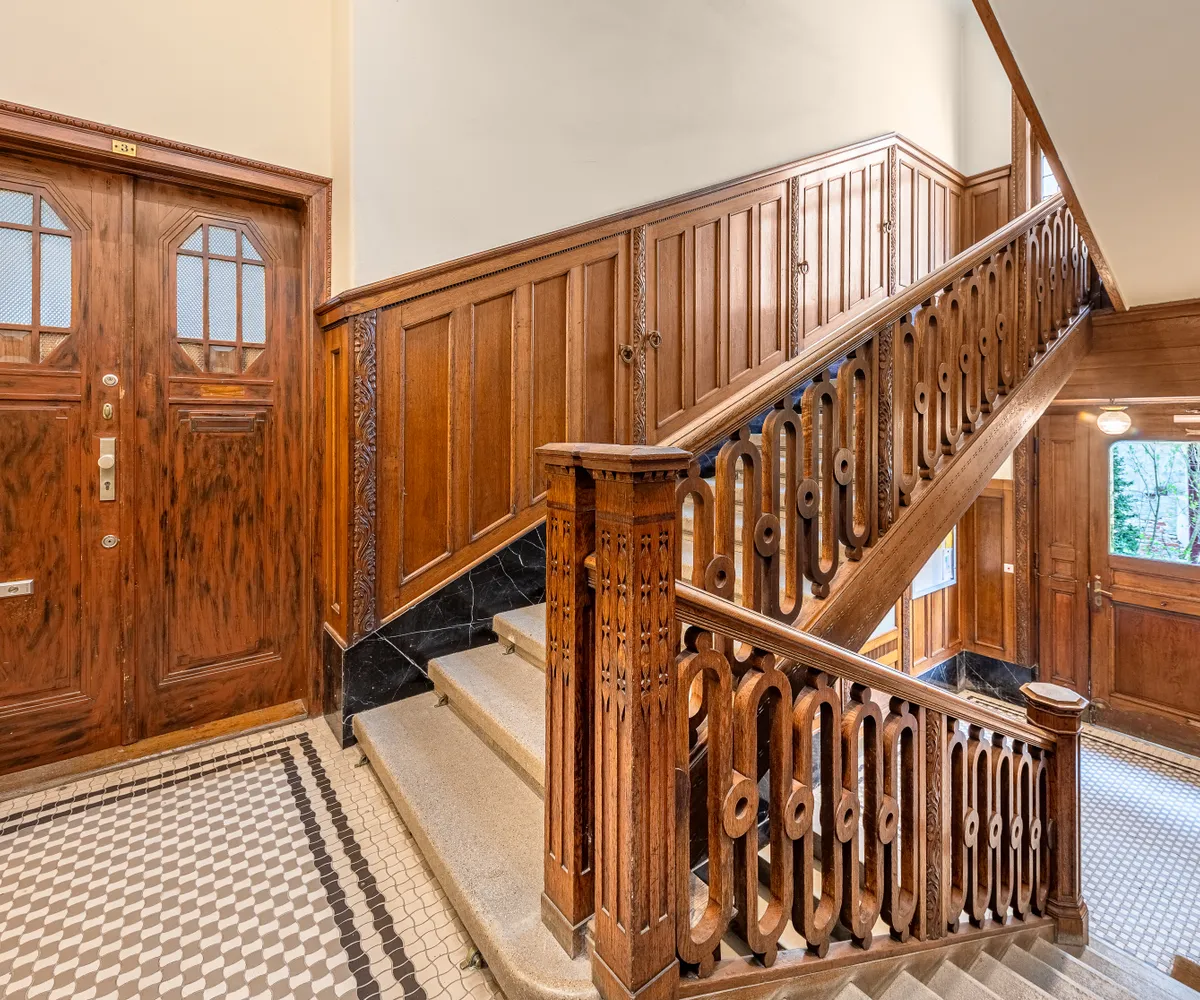 Über das authentisch erhaltene Entrée betreten Sie diese eindrucksvolle Wohnung, die bereits im Eingangsbereich mit originalen Holzelementen den historischen Charakter unter Beweis stellt. Von hier aus gelangen Sie in die großzügige Küche, die vom Wohnbereich getrennt liegt und über umfangreiche Abstellräume verfügt – ideal für stilvolles und funktionales Wohnen.