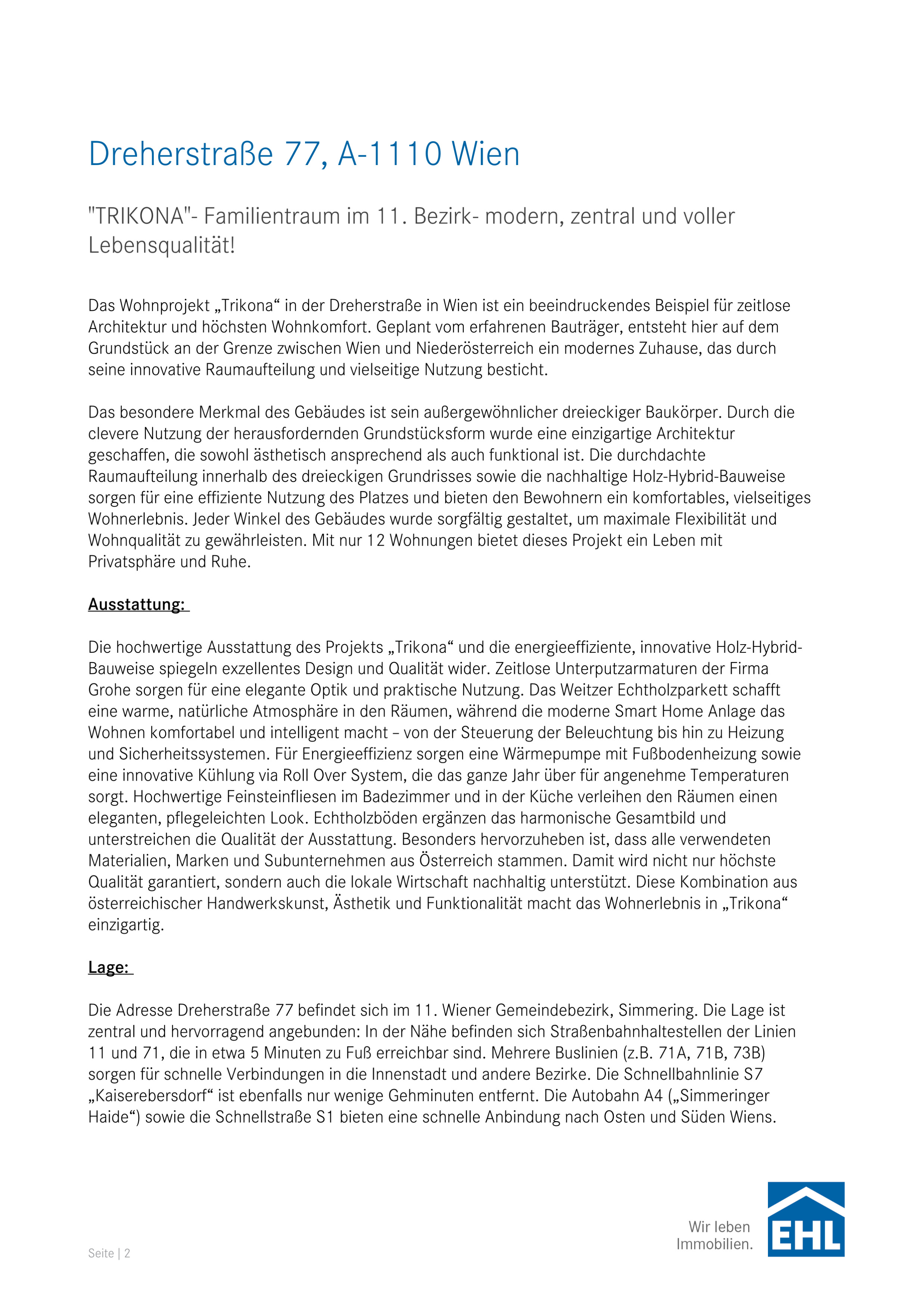 Die hochwertige Ausstattung des Projekts „Trikona“ und die energieeffiziente, innovative Holz-Hybrid-Bauweise spiegeln exzellentes Design und Qualität wider. Zeitlose Unterputzarmaturen der Firma Grohe sorgen für eine elegante Optik und praktische Nutzung. Das Weitzer Echtholzparkett schafft eine warme, natürliche Atmosphäre in den Räumen, während die moderne Smart Home Anlage das Wohnen komfortabel und intelligent macht – von der Steuerung der Beleuchtung bis hin zu Heizung und Sicherheitssystemen. Für Energieeffizienz sorgen eine Wärmepumpe mit Fußbodenheizung sowie eine innovative Kühlung via Roll Over System, die das ganze Jahr über für angenehme Temperaturen sorgt. Hochwertige Feinsteinfliesen im Badezimmer und in der Küche verleihen den Räumen einen eleganten, pflegeleichten Look. Echtholzböden ergänzen das harmonische Gesamtbild und unterstreichen die Qualität der Ausstattung. Besonders hervorzuheben ist, dass alle verwendeten Materialien, Marken und Subunternehmen aus Österreich stammen. Damit wird nicht nur höchste Qualität garantiert, sondern auch die lokale Wirtschaft nachhaltig unterstützt. Diese Kombination aus österreichischer Handwerkskunst, Ästhetik und Funktionalität macht das Wohnerlebnis in „Trikona“ einzigartig.