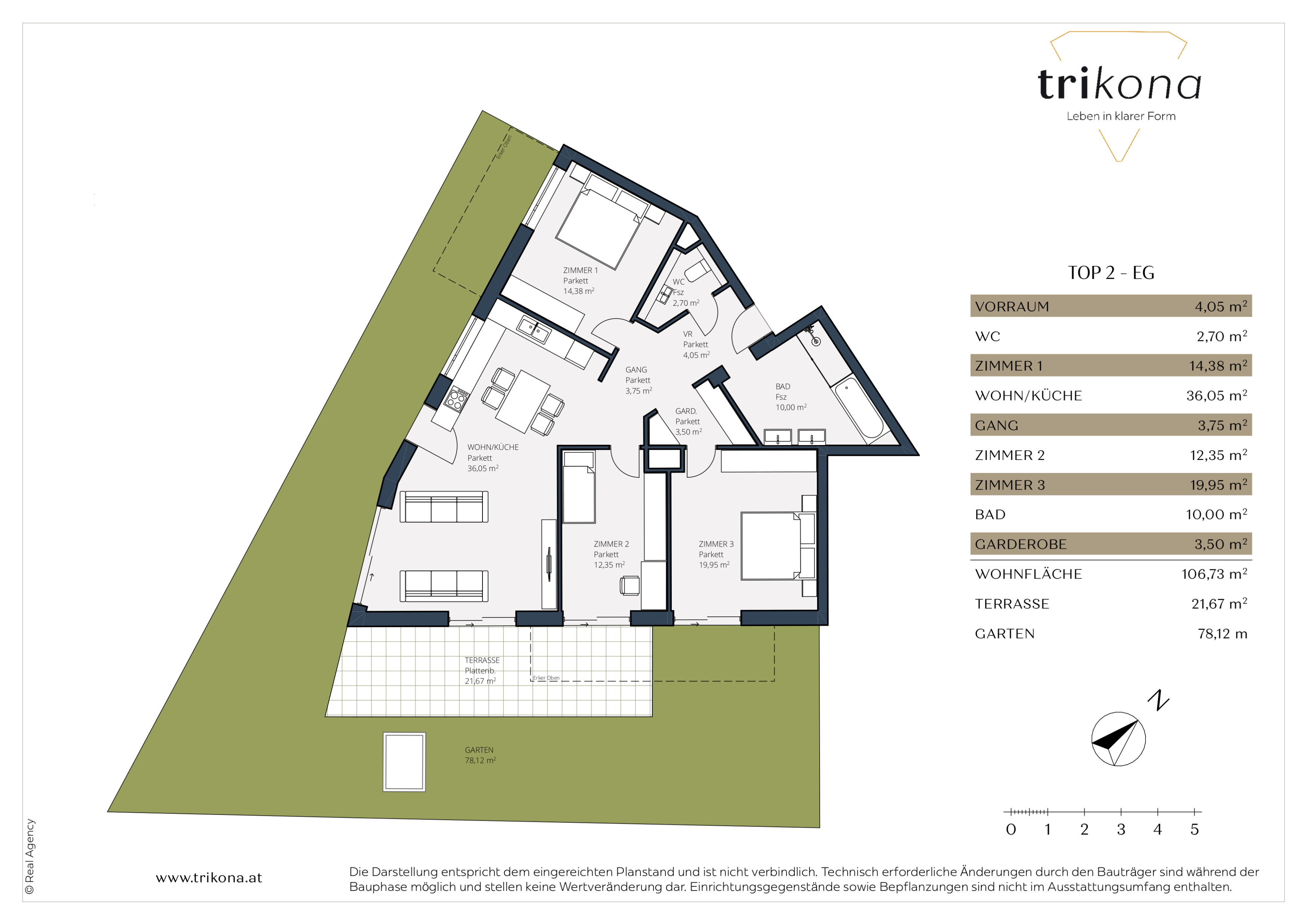 Die hochwertige Ausstattung des Projekts „Trikona“ und die energieeffiziente, innovative Holz-Hybrid-Bauweise spiegeln exzellentes Design und Qualität wider. Zeitlose Unterputzarmaturen der Firma Grohe sorgen für eine elegante Optik und praktische Nutzung. Das Weitzer Echtholzparkett schafft eine warme, natürliche Atmosphäre in den Räumen, während die moderne Smart Home Anlage das Wohnen komfortabel und intelligent macht – von der Steuerung der Beleuchtung bis hin zu Heizung und Sicherheitssystemen. Für Energieeffizienz sorgen eine Wärmepumpe mit Fußbodenheizung sowie eine innovative Kühlung via Roll Over System, die das ganze Jahr über für angenehme Temperaturen sorgt. Hochwertige Feinsteinfliesen im Badezimmer und in der Küche verleihen den Räumen einen eleganten, pflegeleichten Look. Echtholzböden ergänzen das harmonische Gesamtbild und unterstreichen die Qualität der Ausstattung. Besonders hervorzuheben ist, dass alle verwendeten Materialien, Marken und Subunternehmen aus Österreich stammen. Damit wird nicht nur höchste Qualität garantiert, sondern auch die lokale Wirtschaft nachhaltig unterstützt. Diese Kombination aus österreichischer Handwerkskunst, Ästhetik und Funktionalität macht das Wohnerlebnis in „Trikona“ einzigartig.