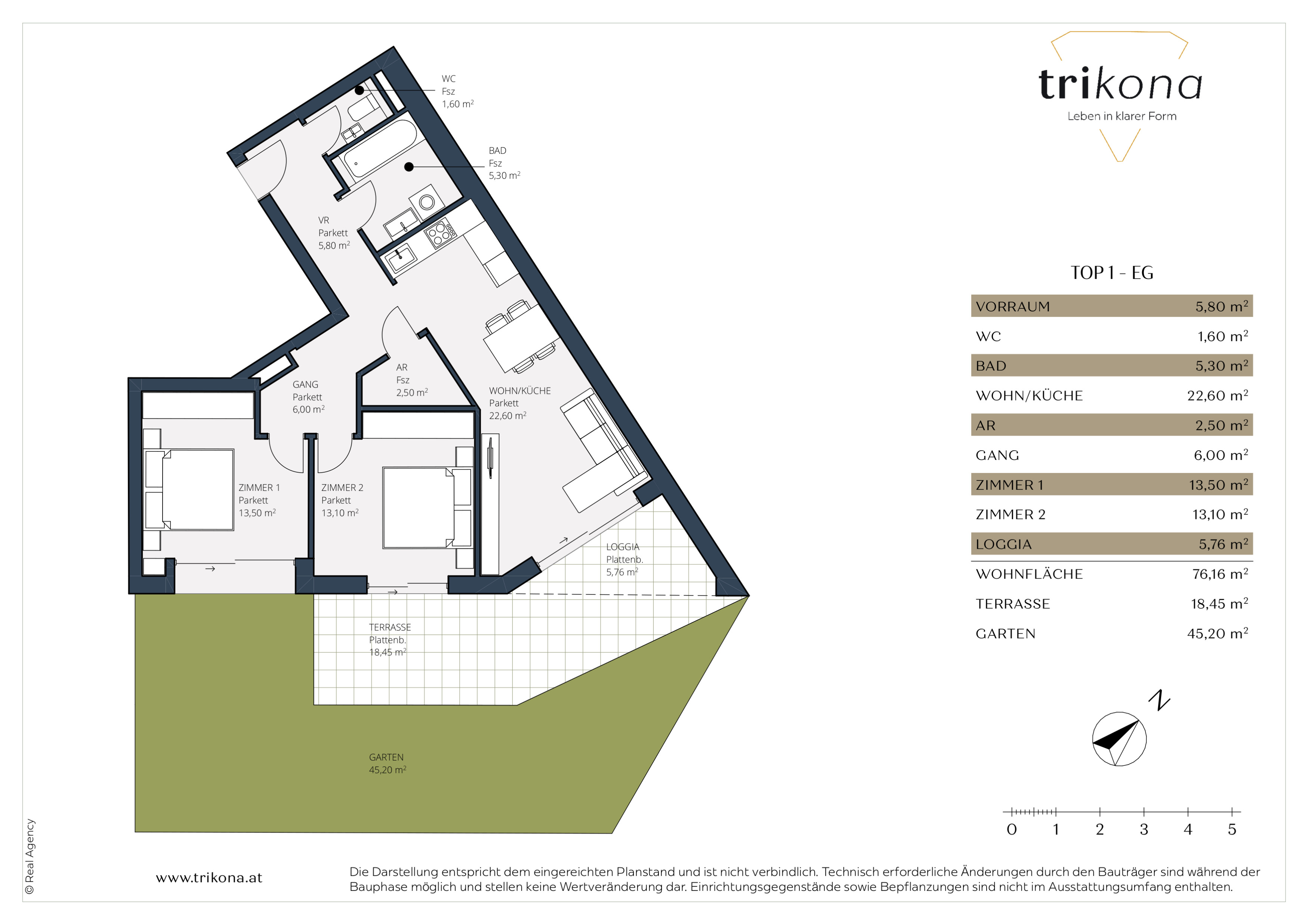 Die hochwertige Ausstattung des Projekts „Trikona“ und die energieeffiziente, innovative Holz-Hybrid-Bauweise spiegeln exzellentes Design und Qualität wider. Zeitlose Unterputzarmaturen der Firma Grohe sorgen für eine elegante Optik und praktische Nutzung. Das Weitzer Echtholzparkett schafft eine warme, natürliche Atmosphäre in den Räumen, während die moderne Smart Home Anlage das Wohnen komfortabel und intelligent macht – von der Steuerung der Beleuchtung bis hin zu Heizung und Sicherheitssystemen. Für Energieeffizienz sorgen eine Wärmepumpe mit Fußbodenheizung sowie eine innovative Kühlung via Roll Over System, die das ganze Jahr über für angenehme Temperaturen sorgt. Hochwertige Feinsteinfliesen im Badezimmer und in der Küche verleihen den Räumen einen eleganten, pflegeleichten Look. Echtholzböden ergänzen das harmonische Gesamtbild und unterstreichen die Qualität der Ausstattung. Besonders hervorzuheben ist, dass alle verwendeten Materialien, Marken und Subunternehmen aus Österreich stammen. Damit wird nicht nur höchste Qualität garantiert, sondern auch die lokale Wirtschaft nachhaltig unterstützt. Diese Kombination aus österreichischer Handwerkskunst, Ästhetik und Funktionalität macht das Wohnerlebnis in „Trikona“ einzigartig.