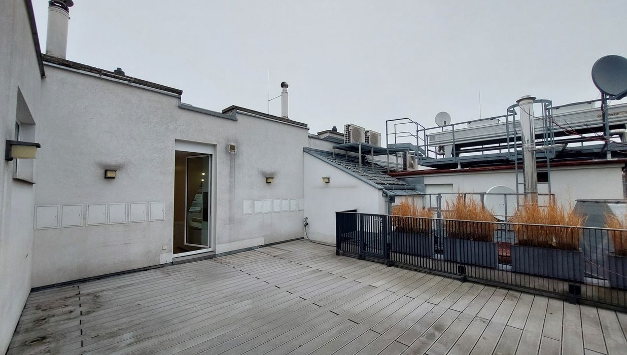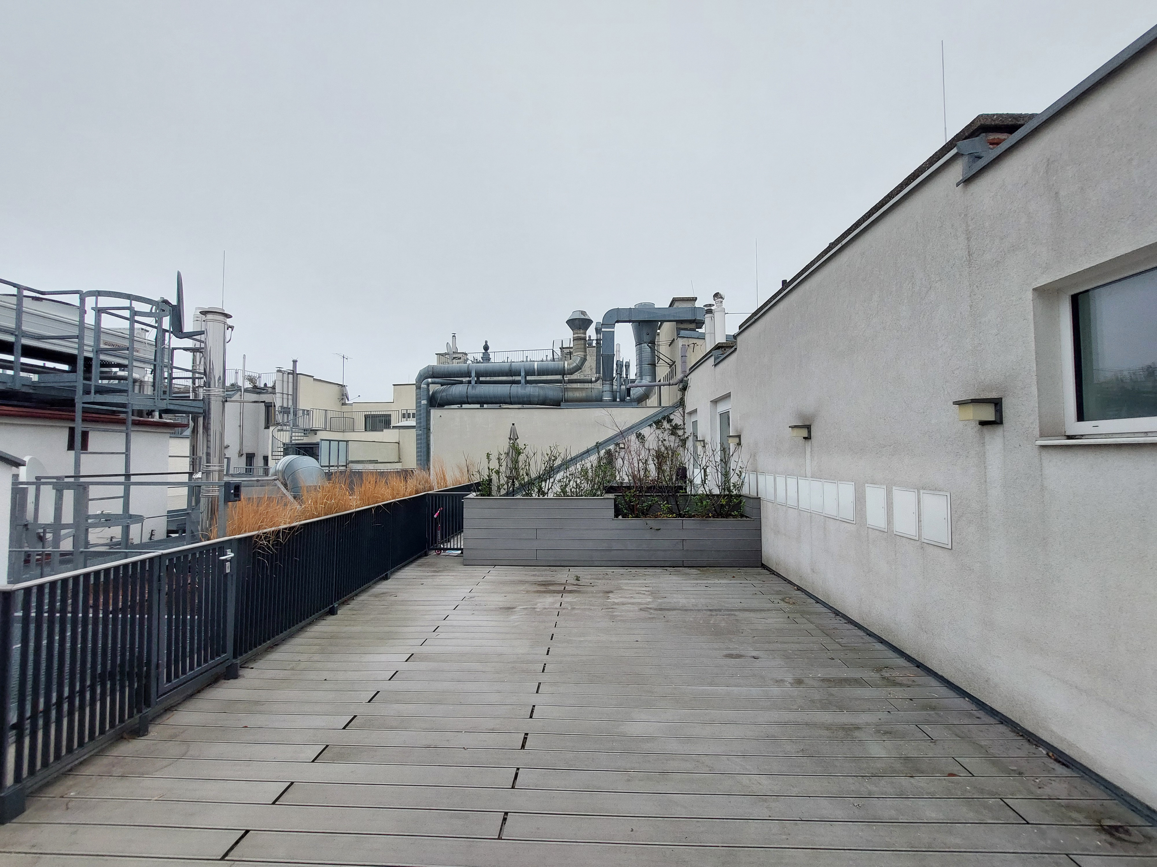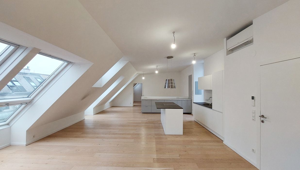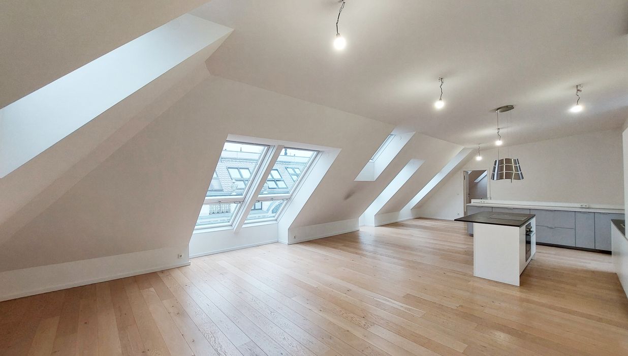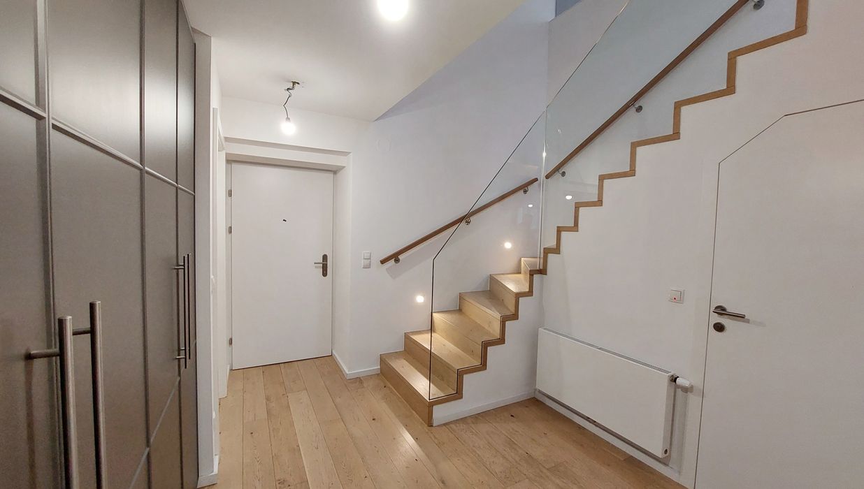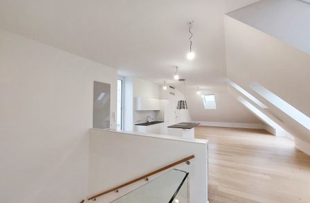 Die Wohnung befindet sich in der 6. Etage und gliedert sich in eine großzügige Wohnküche mit eigenem separaten WC, eine vollausgestattete Einbauküche, zwei separat begehbare Schlafzimmer, wobei eines der beiden in dem höheren Geschoss liegt (beide davon mit Schrankraum), ein Badezimmer mit Doppelhandwaschbecken Dusche und Badewanne, sowie ein zweites Bad mit Dusche und abgetrennter Toilette. Zusätzlich ein weiters separates WC unter dem Stiegenaufgang zum oberen Geschoss, einen Abstellraum mit Waschmaschinenanschluss, sowie einen Vorraum. Die sonnige Terrasse umfasst eine großzügige mit Holzlattenrost überzogene Fläche und lädt zum gemütlichen Verweilen im Freien ein.