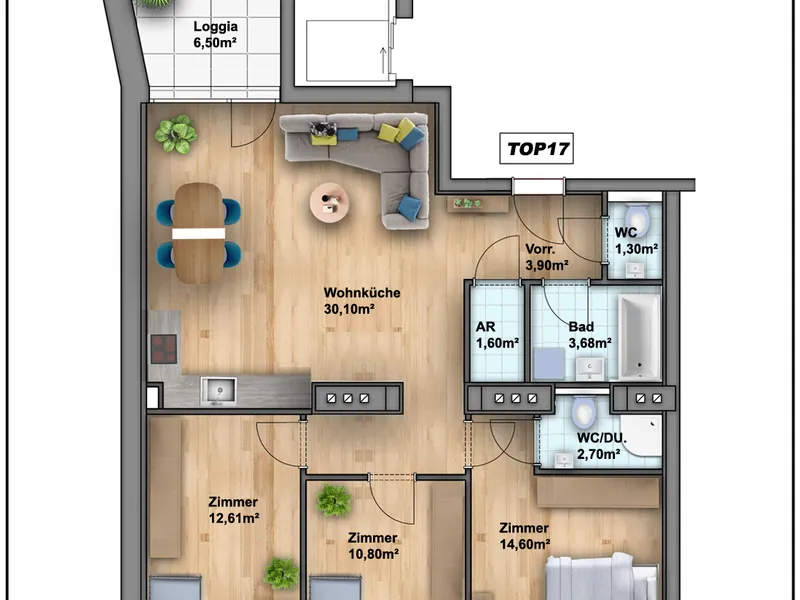 Es erwarten Sie 6 großzügige 3- bis 4-Zimmer-Wohnungen mit Wohnflächen von ca. 85 bis 97m² . Alle Einheiten verfügen über Loggien oder Balkone , teilweise besteht zudem die Möglichkeit zur Adaptierung einer Dachterrasse .