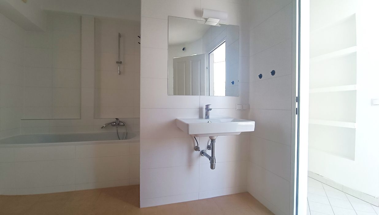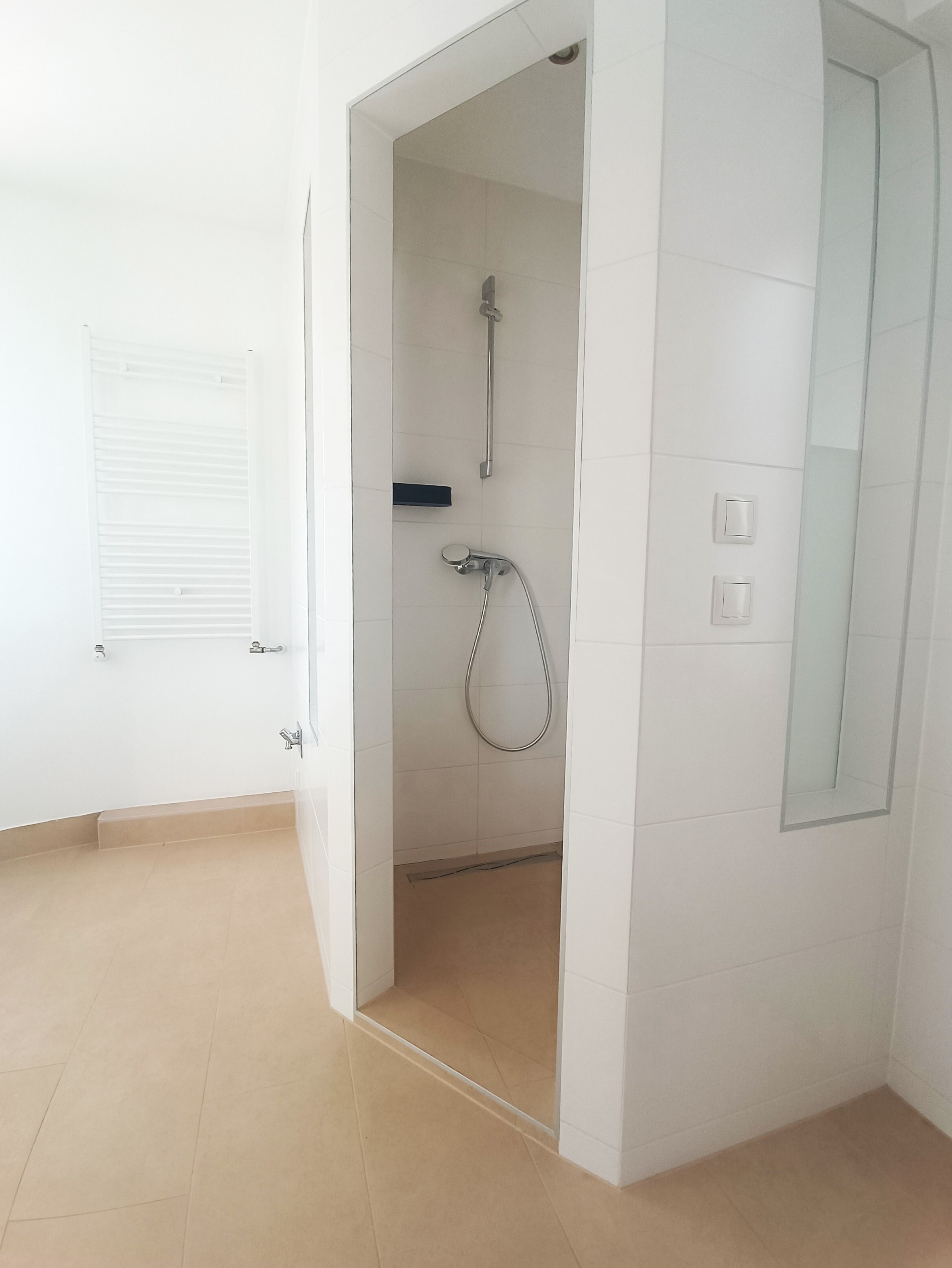 Das Badezimmer überzeugt mit geschmackvollen Fliesen und hochwertiger Ausstattung. Neben Handwaschbecken, Handtuchheizkörper und Waschmaschinen-Anschluss befindet sich hier auch der räumlich abgetrennte Duschbereich mit bodenebener Dusche, sowie eine Badewanne.