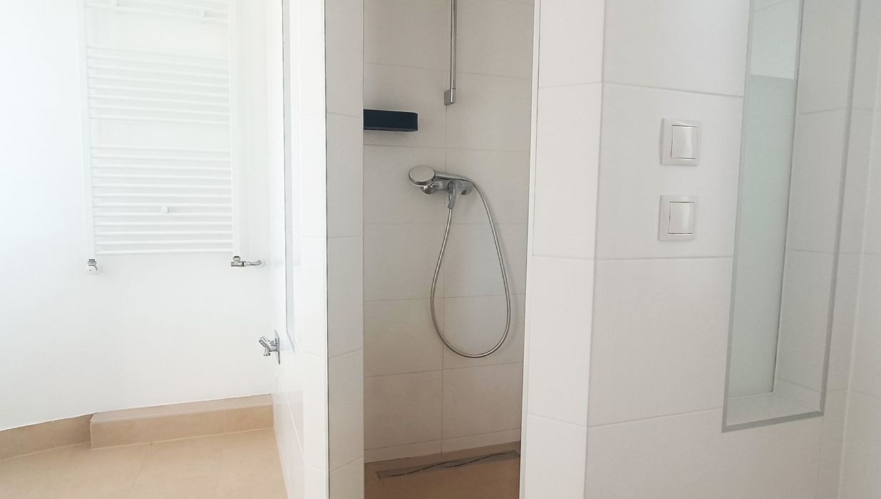 - Badezimmer mit Waschmaschinen Anschluss, Toilette und bodenebener Dusche