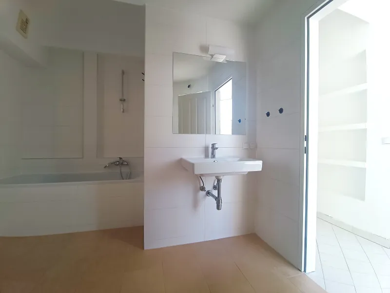 Das Badezimmer überzeugt mit geschmackvollen Fliesen und hochwertiger Ausstattung. Neben Handwaschbecken, Handtuchheizkörper und Waschmaschinen-Anschluss befindet sich hier auch der räumlich abgetrennte Duschbereich mit bodenebener Dusche, sowie eine Badewanne.