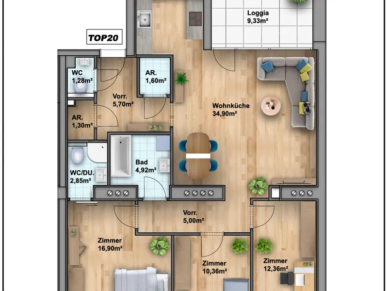 Es erwarten Sie 6 großzügige 3- bis 4-Zimmer-Wohnungen mit Wohnflächen von ca. 85 bis 97m² . Alle Einheiten verfügen über Loggien oder Balkone , teilweise besteht zudem die Möglichkeit zur Adaptierung einer Dachterrasse .