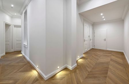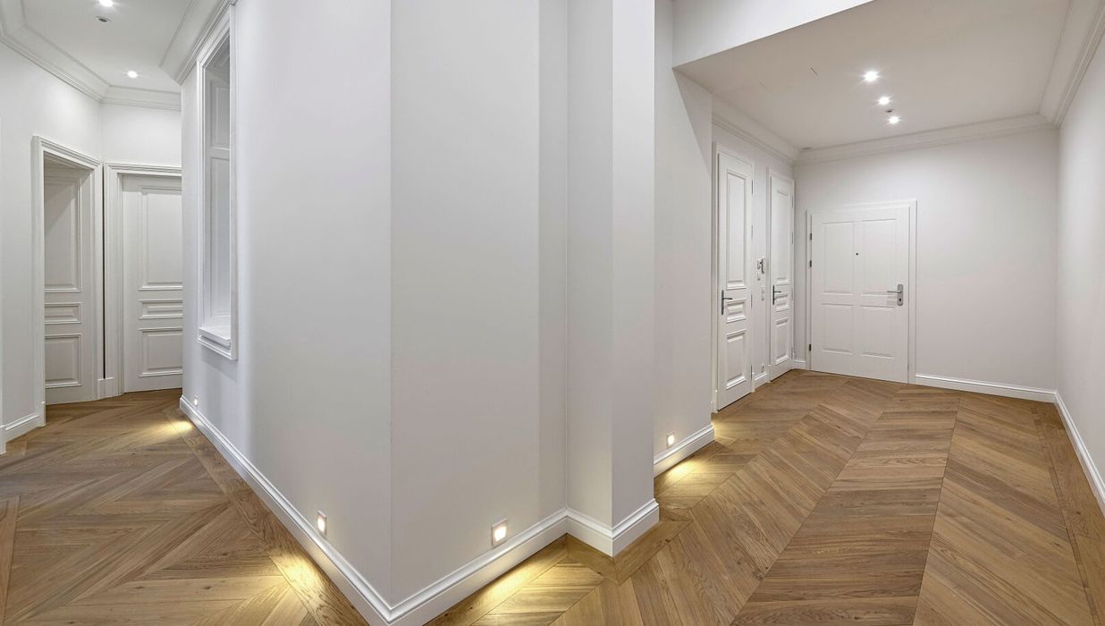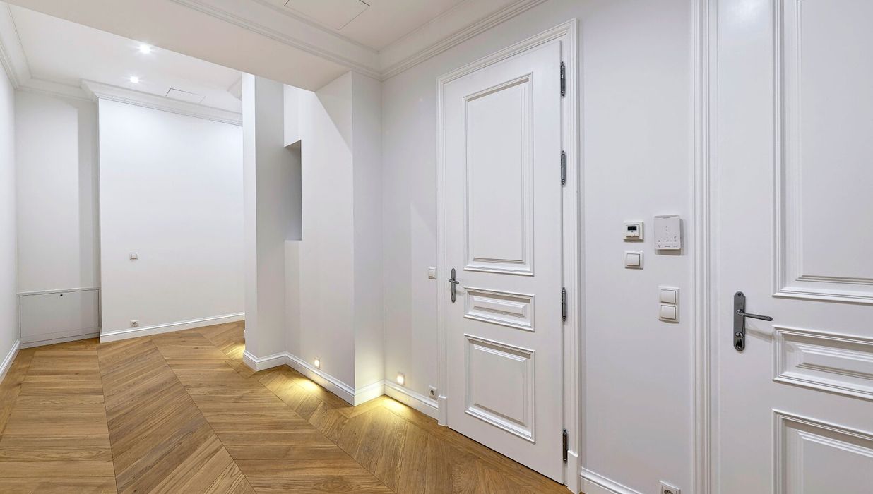 Für die Eingangstüren wurde das traditionelle Modell „Alt Wien“ mit dem Sicherheitsstandard WK3 gewählt. Selbstverständlich entsprechen die Wohnungen auch sonst allen Anforderungen moderner Technik und sind mit einer innovativen Smart-Home-Steuerung ausgestattet. Mit dem System von Button-Intelligent-Living können alle Funktionen von der Beleuchtung bis zur Raumtemperatur über ein iPad komfortabel von überall aus geregelt werden – Wandhalterung und Ladestation sind bereits vorhanden. Elegante Wand-, Boden- und Deckenleuchten setzen die weitläufigen Räumlichkeiten dezent in Szene.