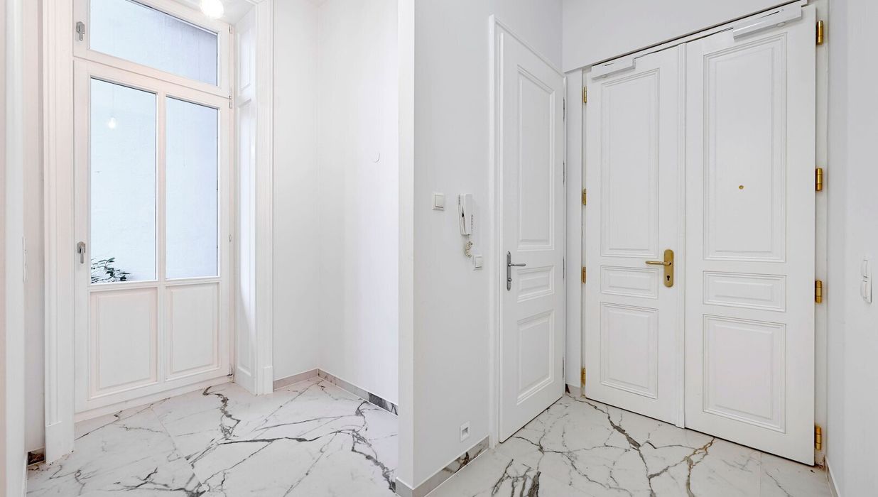 Für die Eingangstüren wurde das traditionelle Modell „Alt Wien“ mit dem Sicherheitsstandard WK3 gewählt. Selbstverständlich entsprechen die Wohnungen auch sonst allen Anforderungen moderner Technik und sind mit einer innovativen Smart-Home-Steuerung ausgestattet. Mit dem System von Button-Intelligent-Living können alle Funktionen von der Beleuchtung bis zur Raumtemperatur über ein iPad komfortabel von überall aus geregelt werden – Wandhalterung und Ladestation sind bereits vorhanden. Elegante Wand-, Boden- und Deckenleuchten setzen die weitläufigen Räumlichkeiten dezent in Szene.