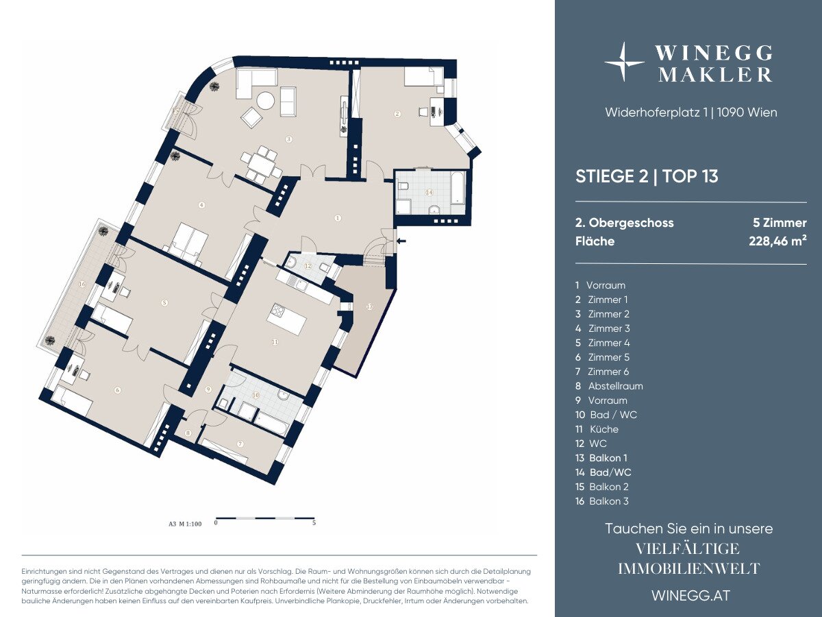 Diese wundervoll aufgeteilte Herrschaftswohnung mit einer Wohnfläche von knapp 229 m² zzgl. 3 Balkonen von insgesamt 18,37 m², teilt sich wie folgt auf: