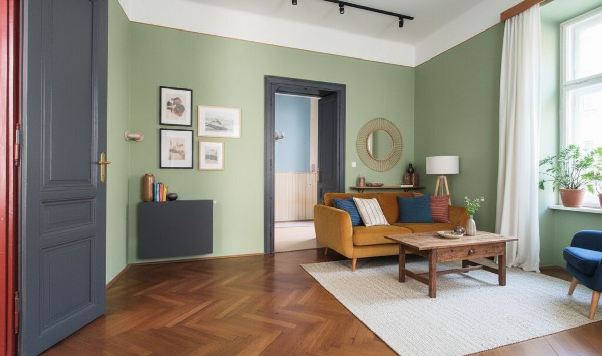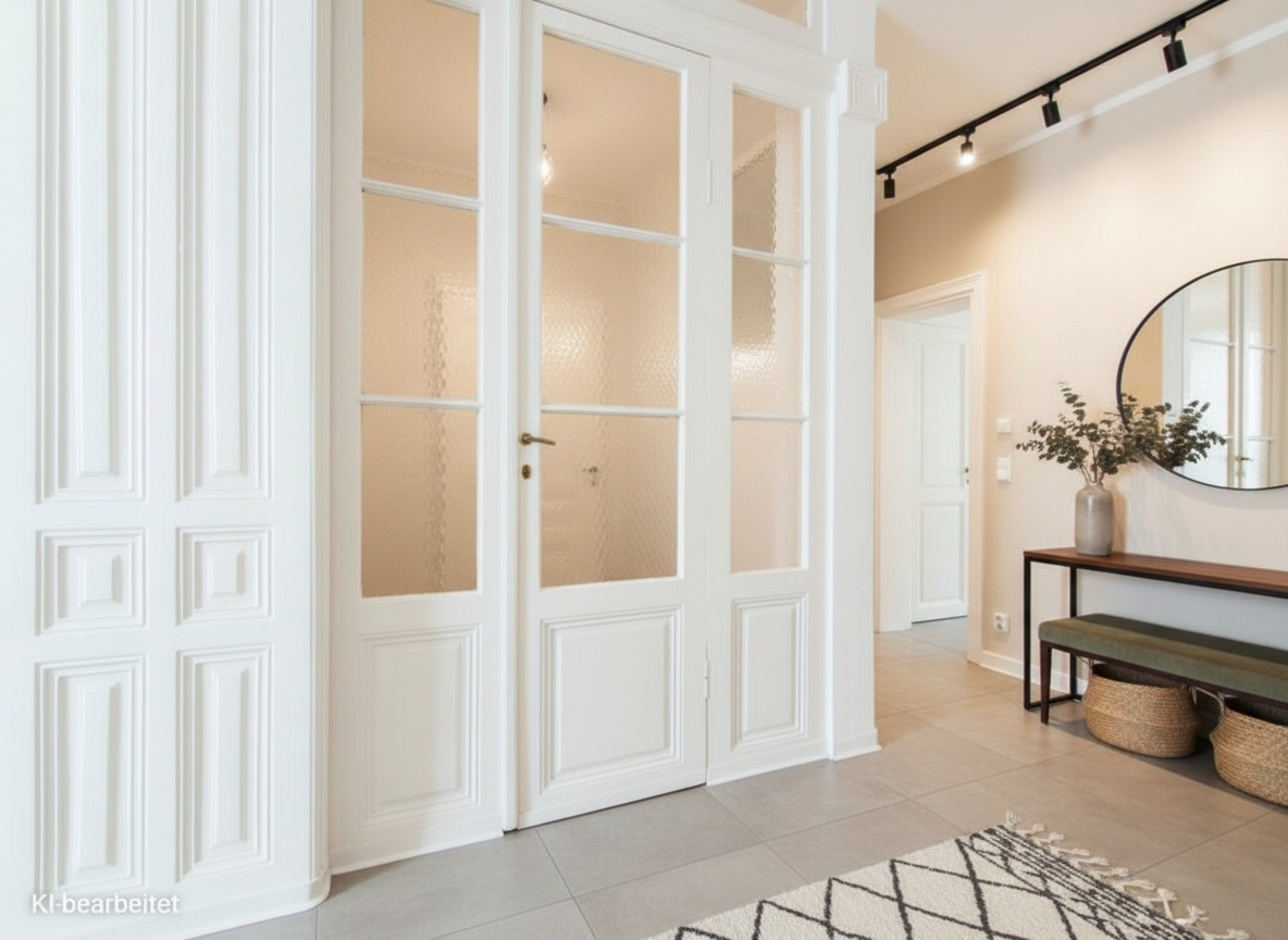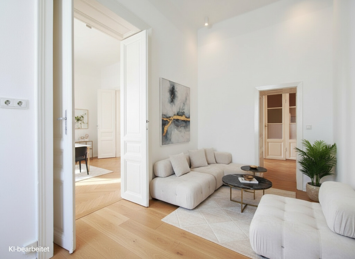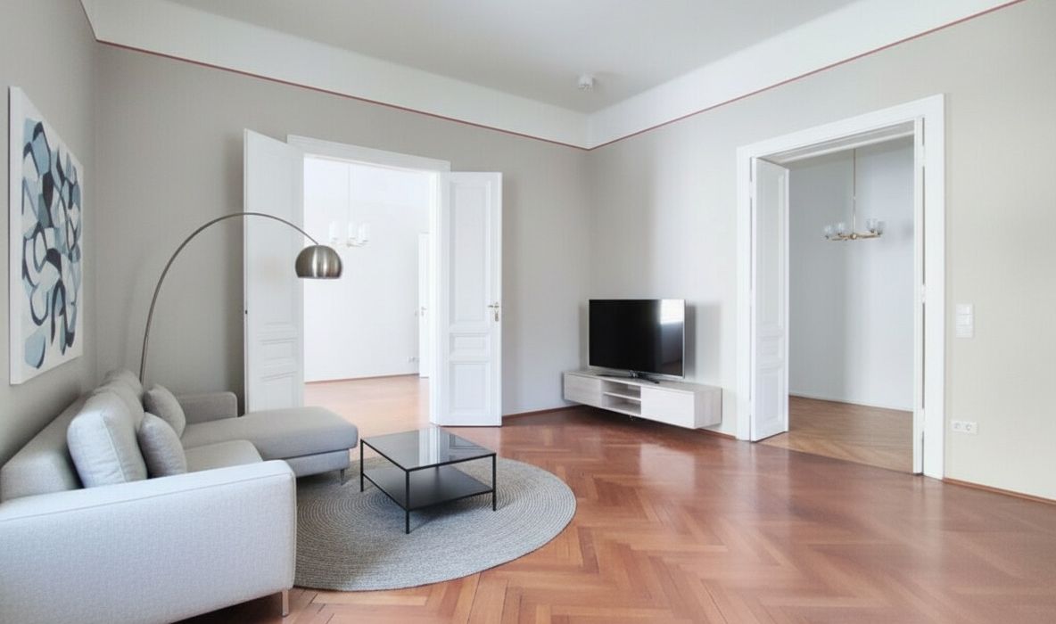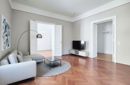 Die Zimmer sind durch klassische Flügeltüren verbunden. Holzkastenfenster sowie Stabparkettböden verleihen der Wohnung ihren
