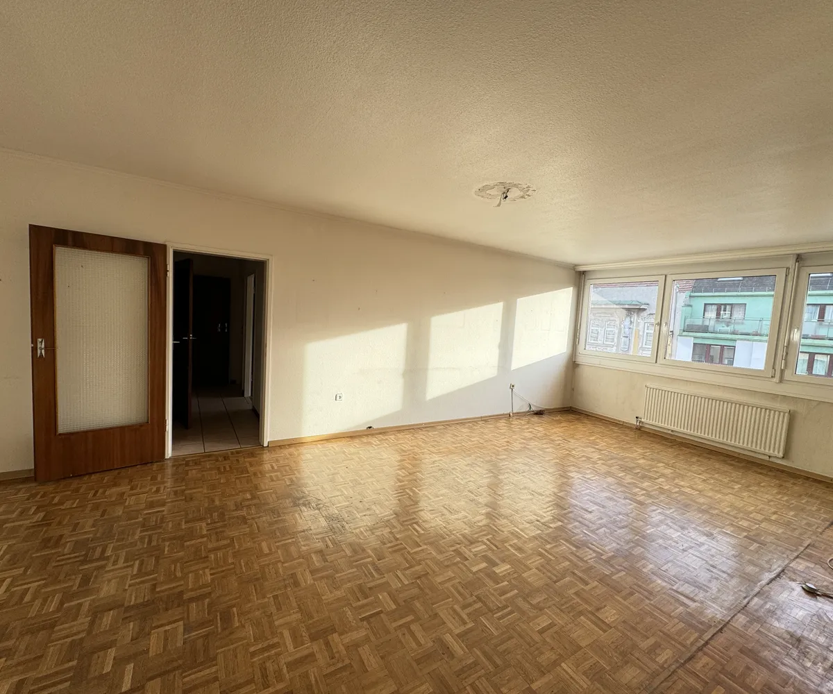 Die Wohnung bietet eine Fläche von ca. 88,49 m2. Die Liegenschaft befindet sich im 4. Liftstock und besticht mit 3 großzügigen Zimmern, einem Vorraum, zwei Abstellräumen, einer separaten Küche, Badezimmer mit Dusche sowie ein separates WC. Die südliche Ausrichtung sorgt für ein helles Wohnambiente.