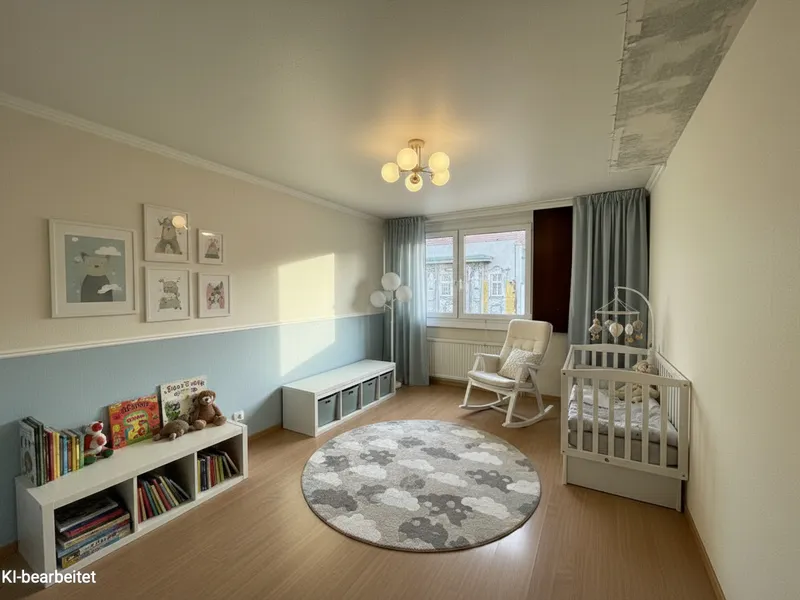 Die dargestellten möblierten Räume sind KI-generierte Visualisierungen und dienen lediglich der Veranschaulichung möglicher Einrichtungskonzepte . Die Möblierung und Sanierung ist nicht im Kaufpreis enthalten .