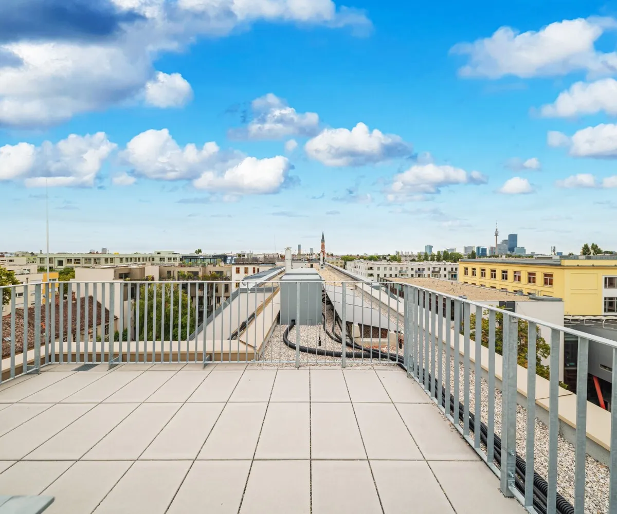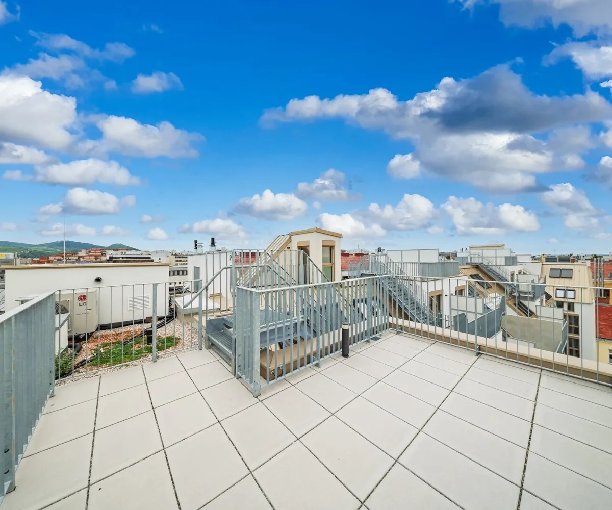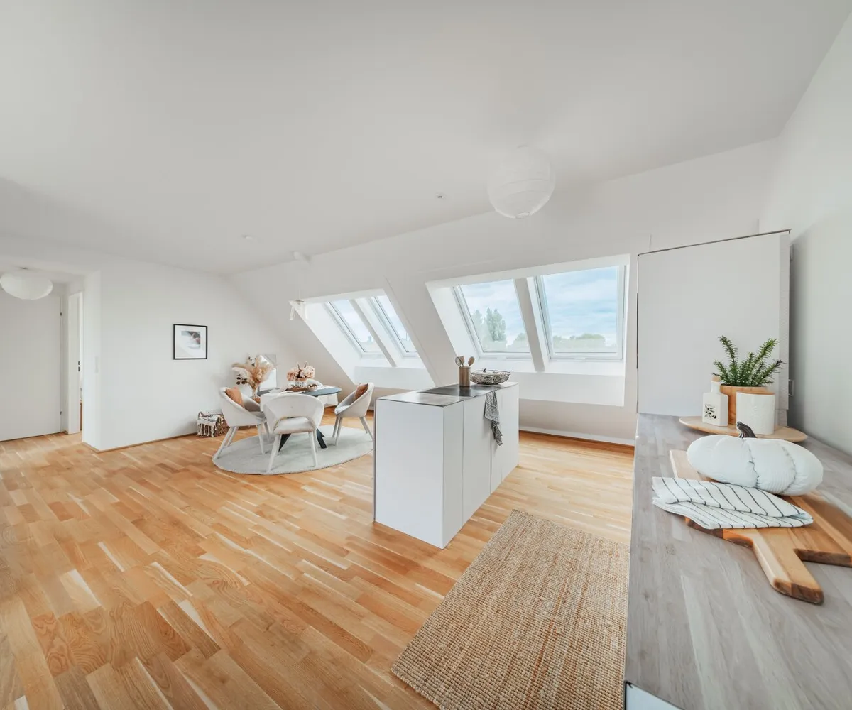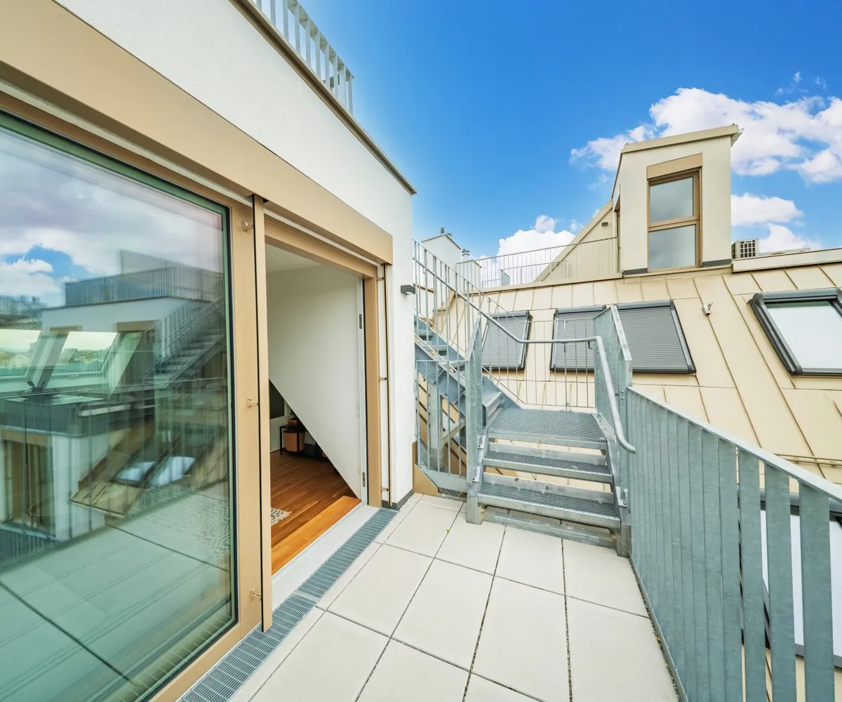 Die 2-Zimmer-Wohnung mit ca. 98 m² Wohnnutzfläche sowie einer Terrasse und einer privaten Dachterrasse befindet sich im 2. Dachgeschoss.